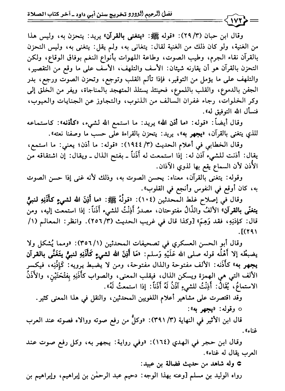 وقال أيضًا: "قوله: "ما أذن الله" يريد: ما استمع الله لشيء، "كأذنه": كاستماعه للذي يتغنى بالقرآن، "يجهر به"، يريد: يتحزن بالقراءة على حسب ما وصفنا نعته".