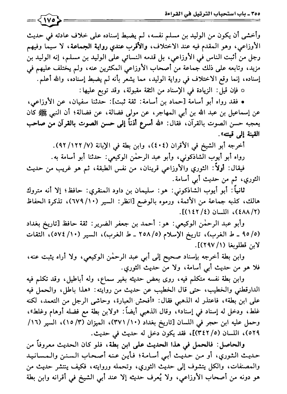 والحاصل: فالحمل في هذا الحديث على ابن بطة، فلو كان الحديث معروفًا من حديث الثوري، أو من حديث أبي أسامة؛ فاين عنه أصحاب السنن والمسانيد والمصنفات، والكل يتشوف إلى حديث الثوري، وتحمله وروايته، فكيف ينتشر حديث من هو دونه من أصحاب الأوزاعي، ولا يُعرف حديثه إلا عند أبي الشيخ في أقرانه وابن بطة