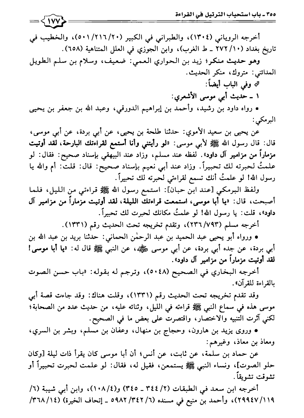 عن يحيى بن سعيد الأموي: حدثنا طلحة بن يحيى، عن أبي بردة، عن أبي موسى، قال: قال رسول الله - صلى الله عليه وسلم - لأبي موسى: "لو رأيتني وأنا أستمع لقراءتك البارحة، لقد أوتيت مزمارًا من مزامير آل داود". لفظه عند مسلم، وزاد عند البيهقي بإسناد صحيح: فقال: لو علمتُ لحبرته لك تحبيرًا. وزاد عند أبي نعيم بإسناد صحيح: قال: قلت: أم والله يا رسول الله! لو علمتُ أنك تسمع لقراءتي لحبرته لك تحبيرًا.