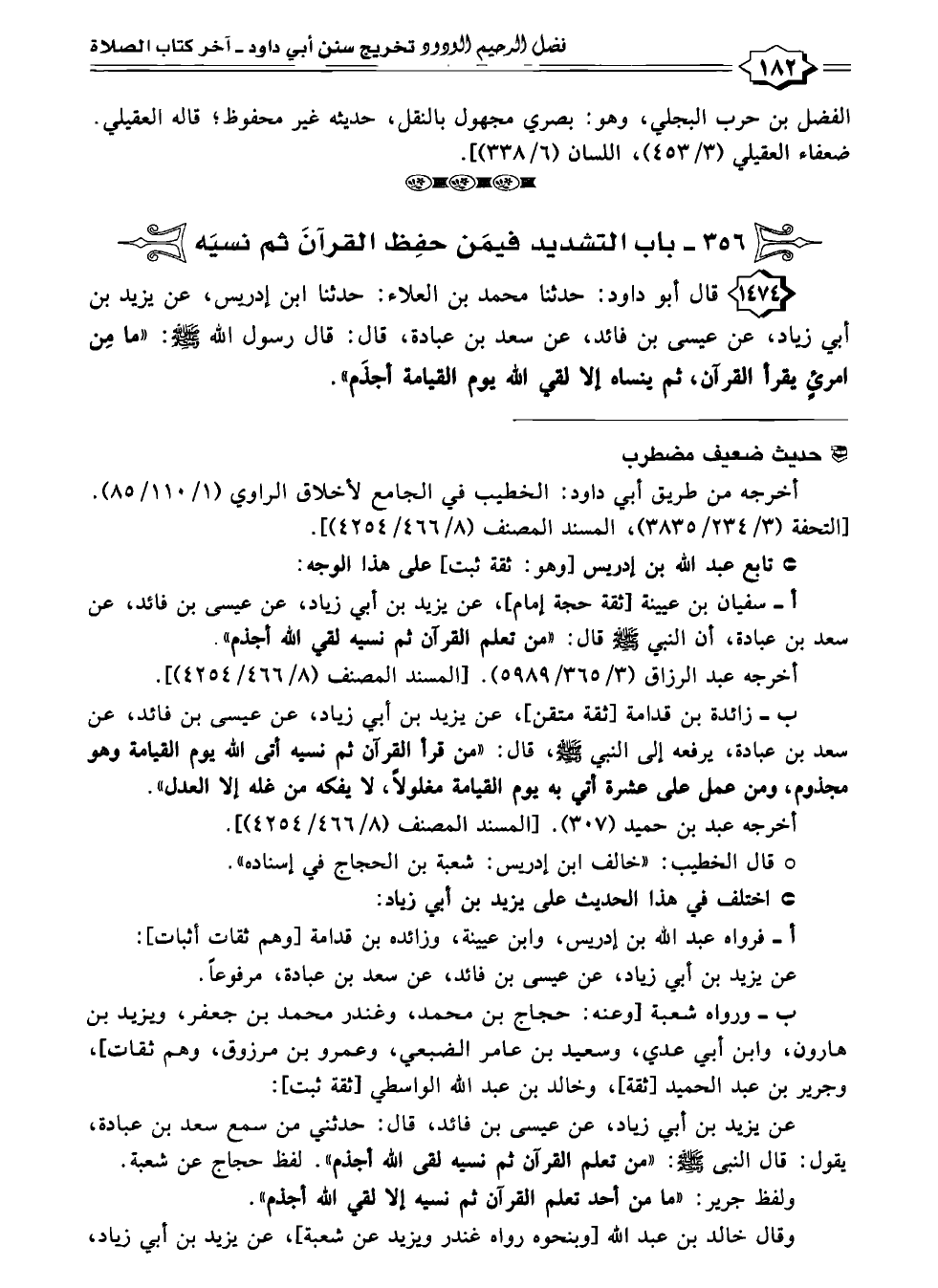 ١٤٧٤ - قال أبو داود: حدثنا محمد بن العلاء: حدثنا ابن إدريس، عن يزيد بن أبي زياد، عن عيسى بن فائد، عن سعد بن عبادة، قال: قال رسول الله - صلى الله عليه وسلم -: "ما مِن امرئٍ يقرأ القرآن، ثم ينساه إلا لقي الله يوم القيامة أجذَم".
