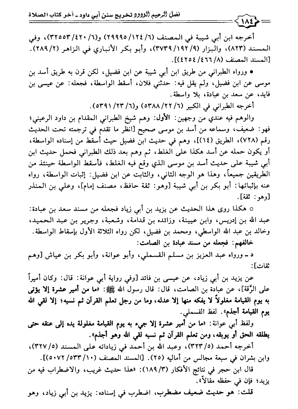 عن يزيد بن أبي زياد، عن عيسى بن فائد [وفي رواية أبي عوانة: قال: وكان أميرًا على الرَّقة]، عن عبادة بن الصامت، قال: قال رسول الله - صلى الله عليه وسلم -: "ما من أمير عشرة إلا يؤتى به يوم القيامة مغلولًا لا يفكه منها إلا عدله، وما من رجل تعلم القرآن ثم نسيه؛ إلا لقي الله يوم القيامة أجذم". لفظ القسملي.