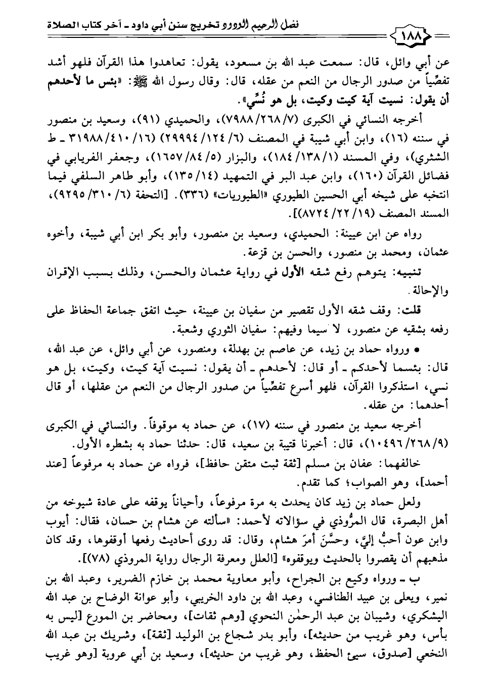 عن أبي وائل، قال: سمعت عبد الله بن مسعود, يقول: تعاهدوا هذا القرآن فلهو أشد تفصِّيًا من صدور الرجال من النعم من عقله، قال: وقال رسول الله - صلى الله عليه وسلم -: "بئس ما لأحدهم أن يقول: نسيت آية كيت وكيت، بل هو نُسِّي".