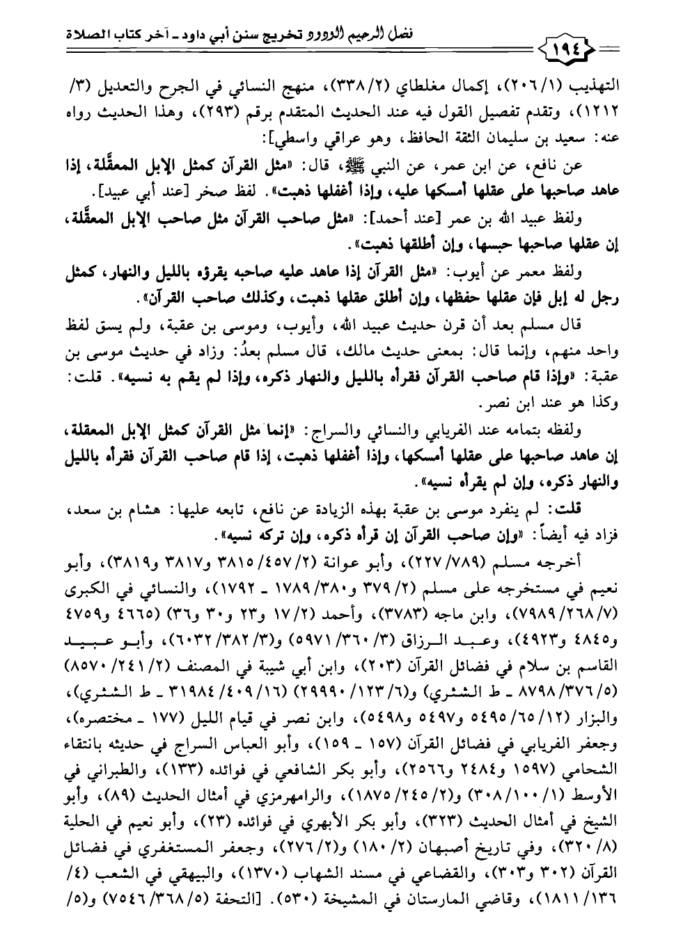 ولفظه بتمامه عند الفريابي والنسائي والسراج: "إنما مثل القرآن كمثل الإبل المعقلة، إن عاهد صاحبها على عقلها أمسكها، وإذا أغفلها ذهبت، إذا قام صاحب القرآن فقرأه بالليل والنهار ذكره، وإن لم يقرأه نسيه".