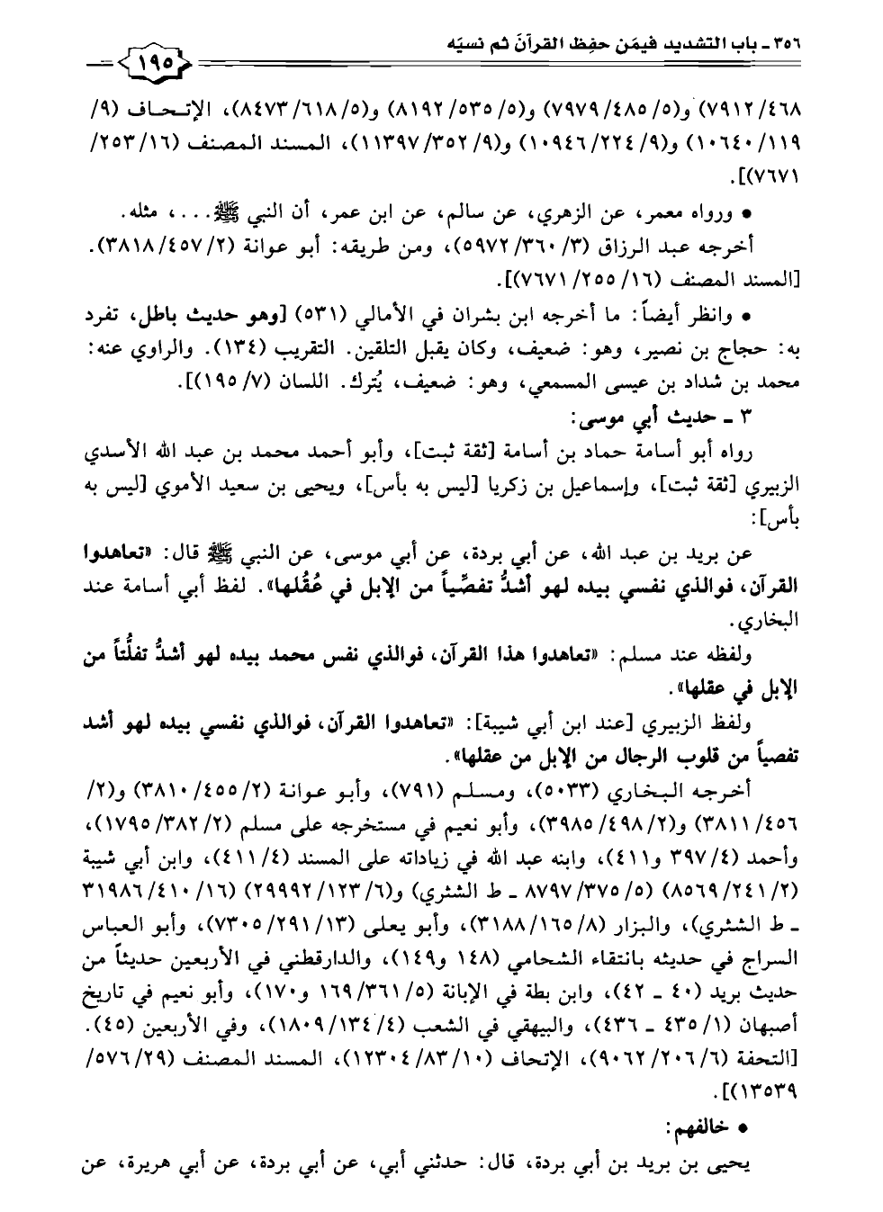 عن بريد بن عبد الله، عن أبي بردة، عن أبي موسى، عن النبي - صلى الله عليه وسلم - قال: "تعاهدوا القرآن، فوالذي نفسي بيده لهو أشدُّ تفصِّيًا من الإبل في عُقُلها". لفظ أبي أسامة عند البخاري.