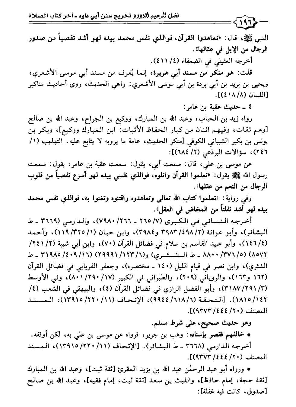عن موسى بن علي، قال: سمعت أبي، يقول: سمعت عقبة بن عامر، يقول: سمعت رسول الله - صلى الله عليه وسلم - يقول: "تعلموا القرآن واتلوه، فوالذي نفسي بيده لهو أسرع تفصيًا من قلوب الرجال من النعم من عقلها".