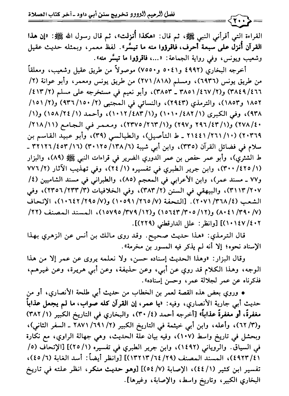 أخرجه البخاري (٤٩٩٢ و ٥٠٤١ و ٧٥٥٠) موصولًا من طريق عقيل وشعيب، ومعلقًا من طريق يونس (٦٩٣٦)، ومسلم (٨١٨/ ٢٧١) من طريق يونس ومعمو، وأبو عوانة (٢/ ٤٦٦/ ٣٨٤٩) و (١/ ٤٦٧/ ٣٨٥٢ - ٣٨٥٣)، وأبو نعيم في مستخرجه على مسلم (٢/ ٤١٣/ ١٨٥٢ و ١٨٥٣)، والترمذي (٢٩٤٣)، والنسائي في المجتبى (٢/ ١٥٠/ ٩٣٦) و (٢/ ١٥١/ ٩٣٨)، وفي الكبرى (١/ ٤٨٢/ ١٠١٠) و (١/ ٤٨٣/ ١٠١٢)، وأحمد (١/ ٢٤/ ١٥٨) و (١/ ٤٠/ ٢٧٨) و (١/ ٤٣/ ٢٩٦ و ٢٩٧) و (١/ ٢٦٣/ ٢٣٧٥)، ومعمر في الجامع (١١/ ٢١٨/ ٢٠٣٦٩) (١٠/ ٢٦١/ ٢١٤٤١ - ط التأصيل)، والطيالسي (٣٩)، وأبو عبيد القاسم بن سلام في فضائل القرآن (٣٣٥)، وابن أبي شيبة (٦/ ١٣٨/ ٣٠١٢٥) (١٦/ ٤٥٣/ ٣٢١٢٦ - ط الشثري)، وأبو عمر حفص بن عمر الدوري الضرير في قراءات النبي - صلى الله عليه وسلم - (٨٩)، والبزار (١/ ٤٢٥/ ٣٠٠)، وابن جرير الطبري في تفسيره (١/ ٢٤)، وفي تهذيب الآثار (٢/ ٧٧٦ و ٧٧ - مسند عمر)، وابن الأعرابي في المعجم (٨٥)، والطبراني في مسند الشاميين (٤/ ٢٠٧/ ٣١١٣)، والبيهقي في السنن (٢/ ٣٨٣)، وفي الخلافيات (٣/ ٢٣٣/ ٢٣٥٦)، وفي الشعب (٤/ ٣٦٨/ ٢٠٧١). [التحفة (٧/ ٢٦٥/ ١٠٥٩١) و (٧/ ٢٩٥/ ١٠٦٤٢)، الإتحاف (٧/ ٣٩٠/ ٨٠٤١) و (١٢/ ٣٠٥/ ١٥٦٤٣) و (١٢/ ٣٧٩/ ١٥٧٩٥)، المسند المصنف (٢٢/ ١٠١٤٧/ ٤٠٢)] [وانظر: علل الدارقطني ٢٢٩١)].