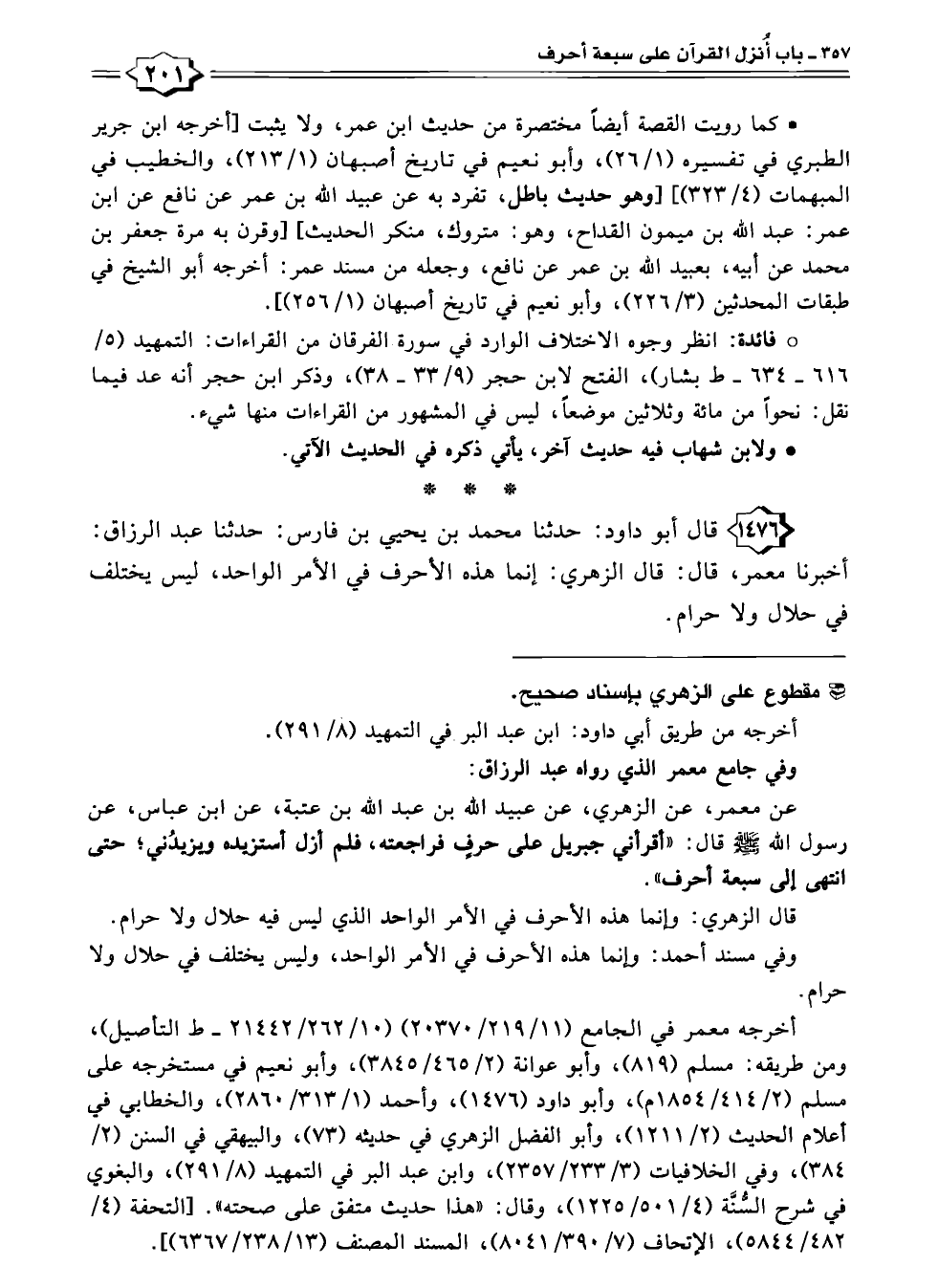 ١٤٧٦ - قال أبو داود: حدثنا محمد بن يحيي بن فارس: حدثنا عبد الرزاق: أخبرنا معمر، قال: قال الزهري: إنما هذه الأحرف في الأمر الواحد، ليس يختلف في حلال ولا حرام.