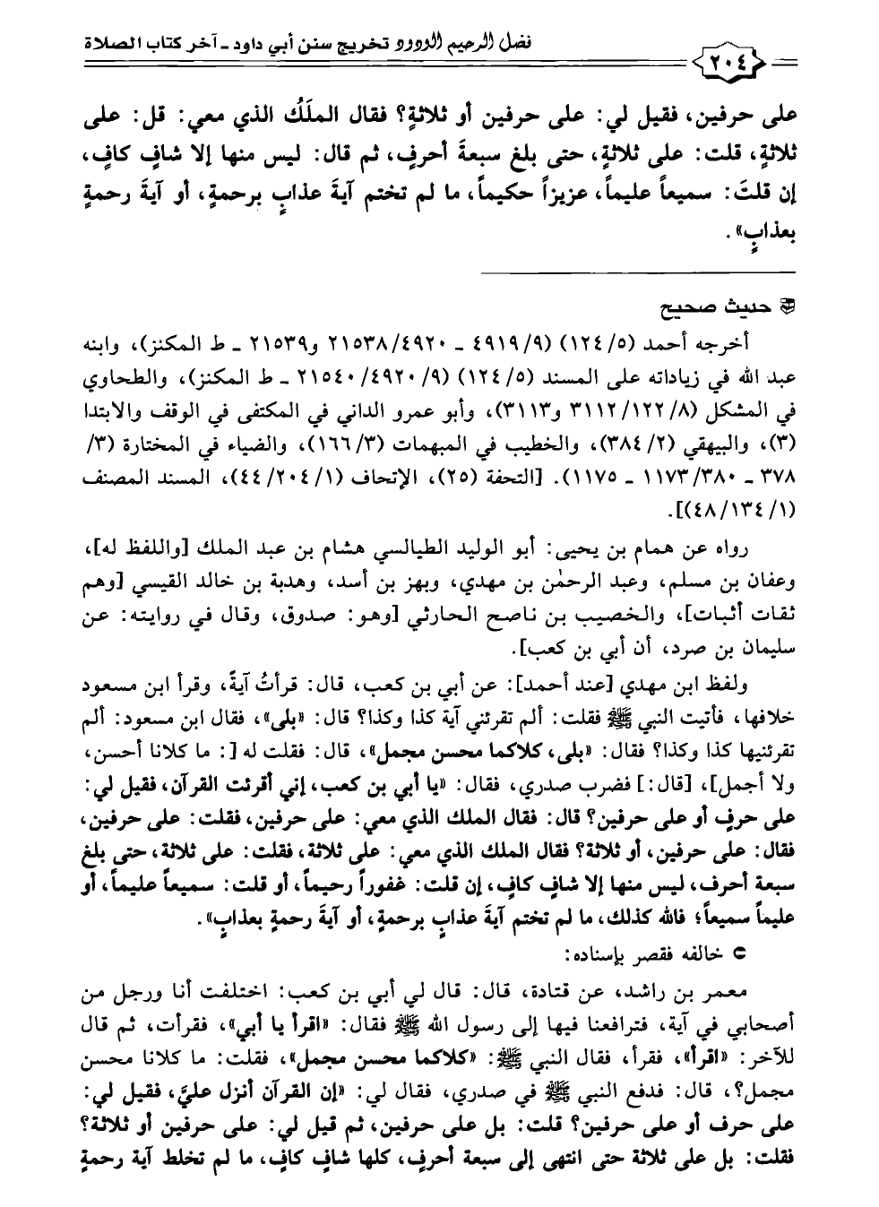 ولفظ ابن مهدي [عند أحمد]: عن أبي بن كعب، قال: قرأتُ آيةً، وقرأ ابن مسعود خلافها، فأتيت النبي - صلى الله عليه وسلم - فقلت: ألم تقرئني آية كذا وكذا؟ قال: "بلى"، فقال ابن مسعود: ألم تقرئنيها كذا وكذا؟ فقال: "بلى، كلاكما محسن مجمل"، قال: فقلت له [: ما كلانا أحسن، ولا أجمل]، [قال:] فضرب صدري، فقال: "يا أبي بن كعب، إني أقرئت القرآن، فقيل لي: على حرفٍ أو على حرفين؟ قال: فقال الملك الذي معي: على حرفين، فقلت: على حرفين، فقال: على حرفين، أو ثلاثة؟ فقال الملك الذي معي: على ثلاثة، فقلت: على ثلاثةٍ، حتى بلغ سبعة أحرفٍ، ليس منها إلا شافٍ كافٍ، إن قلت: غفورًا رحيمًا، أو قلت: سميعًا عليمًا، أو عليمًا سميعًا؛ فالله كذلك، ما لم تختم آيةَ عذابٍ برحمةٍ، أو آيةَ رحمةٍ بعذابٍ".