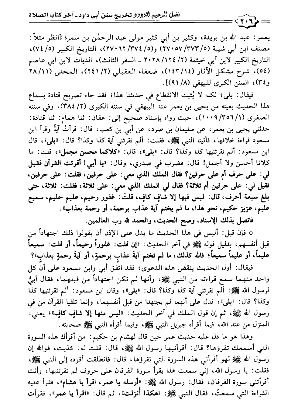 فيقال: بلى؛ لكنه لا يُثبت الانقطاع في حديثنا هذا؛ فقد جاء تصريح قتادة بسماع هذا الحديث بعينه من يحيى بن يعمر عند البيهقي في سننه الكبرى (٢/ ٣٨٤)، وفي سننه الصغرى (١/ ٣٥٦/ ١٠٠٩)، حيث رواه بإسناد صحيح إلى: عفان: ثنا همام: ثنا قتادة: حدثني يحيى بن يعمر، عن سليمان بن صرد، عن أبي بن كعب، قال: قرأتُ آيةً وقرأ ابن مسعود قراءة خلافها، فأتينا النبي - صلى الله عليه وسلم -، فقلت: ألم تقرئني آية كذا وكذا؟ قال: "بلى"، قال ابن مسعود: ألم تقرئنيها كذا وكذا؟ قال: "بلى"، قال: "كلاكما محسن مجمل"، قلت: ما كلانا أحسن ولا أجمل! قال: فضرب في صدري، وقال: "يا أبي! أقرئت القرآن فقيل لى: على حرف أم على حرفين؟ فقال الملك الذي معي: على حرفين، فقلت: على حرفين، فقيل لي: على حرفين أم ثلاثة؟ فقال لى الملك الذي معي: على ثلاثة، فقلت: ثلاثة، حتى بلغ سبعة أحرف، قال: ليس فيها إلا شافٍ كافٍ، قلتَ: غفور رحيم، عليم حليم، سميع عليم، عزيز حكيم، نحو هذا، ما لم يختم آية عذاب برحمة، أو رحمة بعذاب".