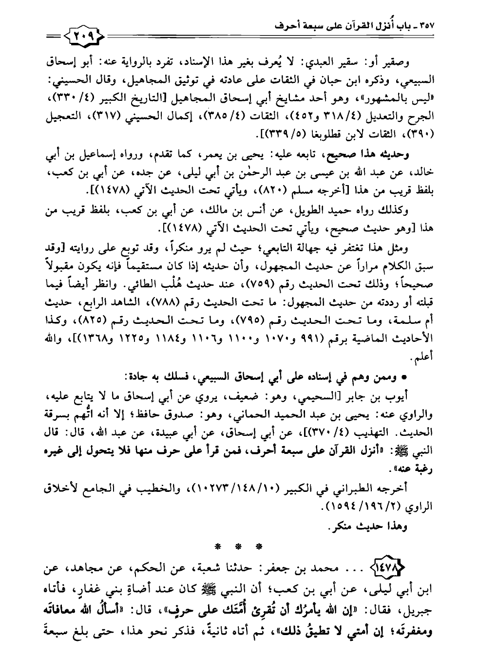 وحديثه هذا صحيح، تابعه عليه: يحيى بن يعمر، كما تقدم، ورواه إسماعيل بن أبي خالد، عن عبد الله بن عيسى بن عبد الرحمن بن أبي ليلى، عن جده، عن أبي بن كعب، بلفظ قريب من هذا [أخرجه مسلم (٨٢٠)، ويأتي تحت الحديث الآتي (١٤٧٨)].