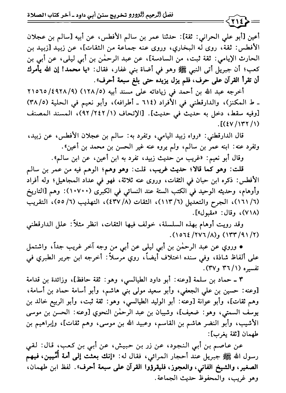 أعين [أبو علي الحراني: ثقة]: حدثنا عمر بن سالم الأفطس، عن أبيه [سالم بن عجلان الأفطس: ثقة، روى له البخاري، وروى عنه جماعة من الثقات]، عن زبيد أزبيد بن الحارث الإيامي: ثقة ثبت، من السادسة]؛ عن عبد الرحمن بن أبي ليلى، عن أبي بن كعب؛ أن جبريل أتى النبي -صلى الله عليه وسلم- وهو في أضاة بني غفار، فقال: "يا محمد! إن الله يأمرك أن تقرأ القرآن على حرف، فلم يزل يزيده حتى بلغ سبعة أحرف".