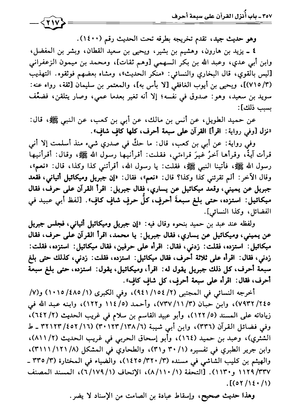 عن حميد الطويل، عن أنس بن مالك، عن أبي بن كعب، عن النبي -صلى الله عليه وسلم-، قال: "نزل [وفي رواية: اقرأ] القرآن على سبعة أحرف، كلها كافٍ شافٍ ".