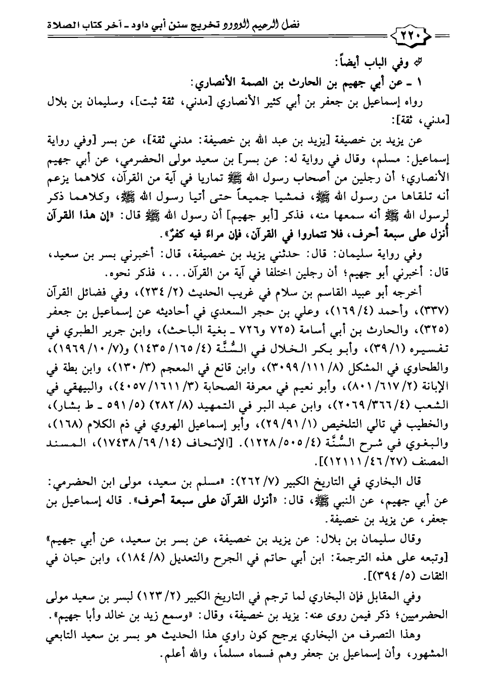 وقال سليمان بن بلال: عن يزيد بن خصيفة، عن بسر بن سعيد، عن أبي جهيم" أوتبعه على هذه الترجمة: ابن أبي حاتم في الجرح والتعديل (٨/ ١٨٤)، وابن حبان في الثقات (٥/ ٣٩٤)].