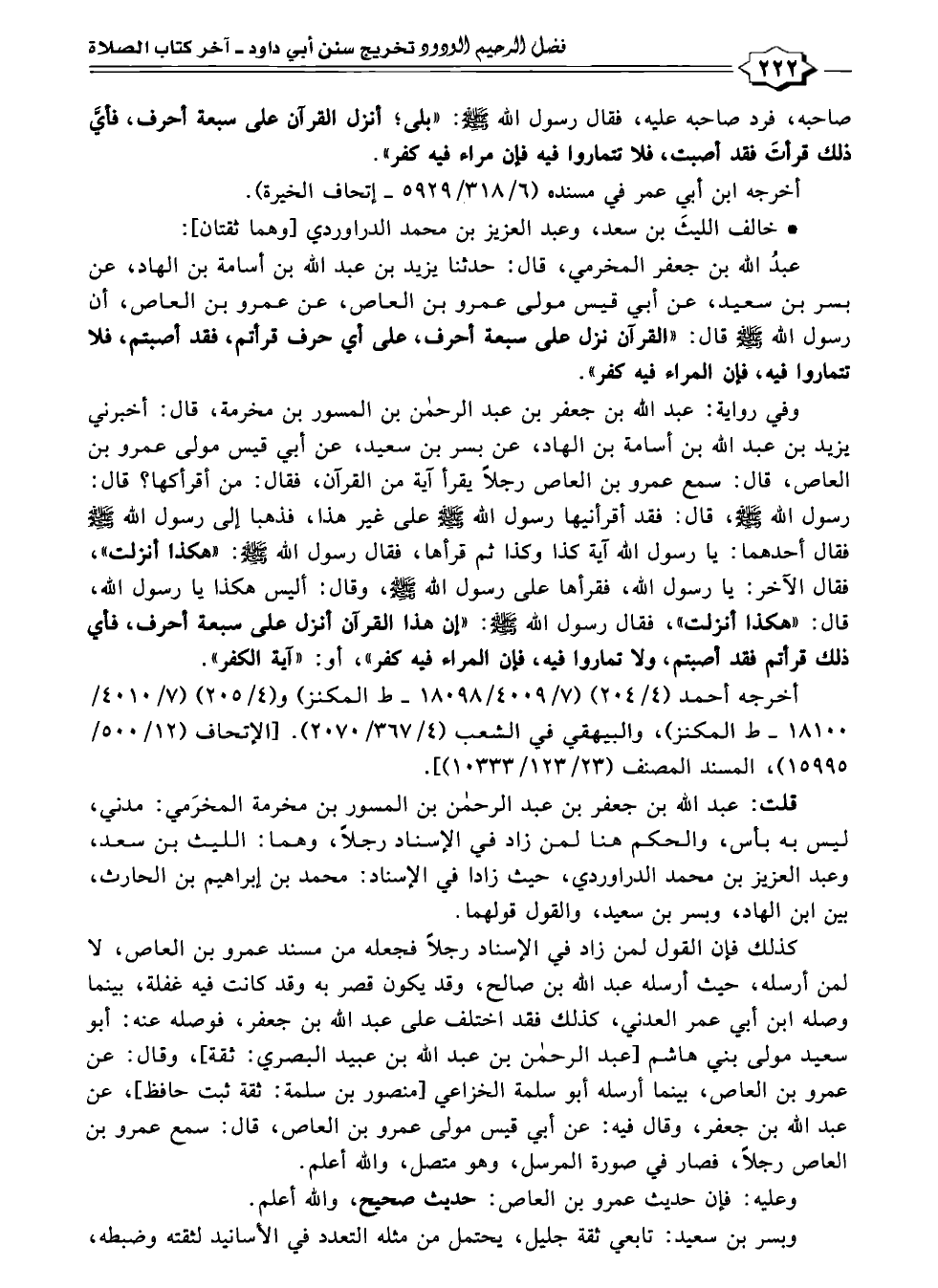 عبدُ الله بن جعفر المخرمي، قال: حدثنا يزيد بن عبد الله بن أسامة بن الهاد، عن بسر بن سعيد، عن أبي قيس مولى عمرو بن العاص، عن عمرو بن العاص، أن رسول الله -صلى الله عليه وسلم- قال: "القرآن نزل على سبعة أحرف، على أي حرف قرأتم، فقد أصبتم، فلا تتماروا فيه، فإن المراء فيه كفر".