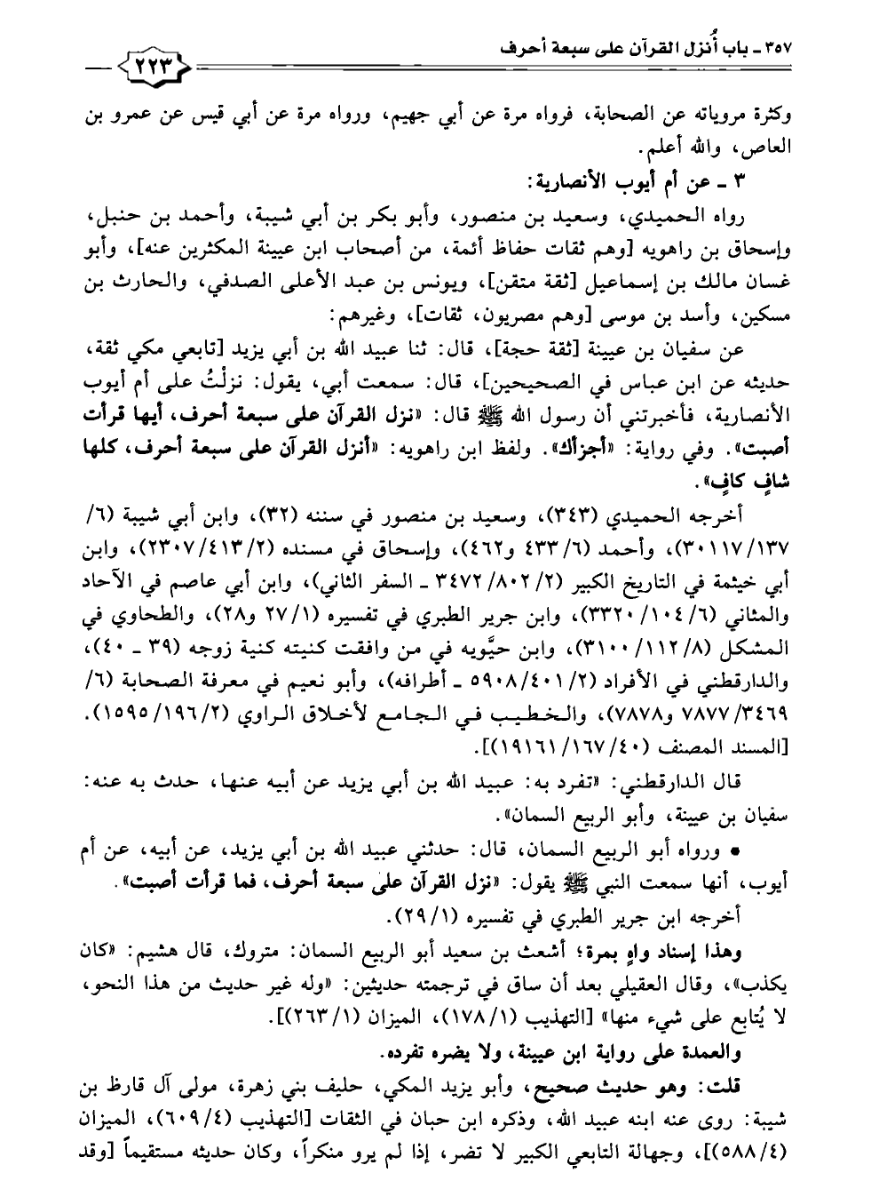 عن سفيان بن عيينة [ثقة حجة]؛ قال: ثنا عبيد الله بن أبي يزيد [تابعي مكي ثقة، حديثه عن ابن عباس في الصحيحين]؛ قال: سمعت أبي، يقول: نزلْتُ على أم أيوب الأنصارية، فأخبرتني أن رسول الله -صلى الله عليه وسلم- قال: "نزل القرآن على سبعة أحرف، أيها قرأت أصبت". وفي رواية: "أجزأك". ولفظ ابن راهويه: "أنزل القرآن على سبعة أحرف، كلها شافٍ كافٍ ".
