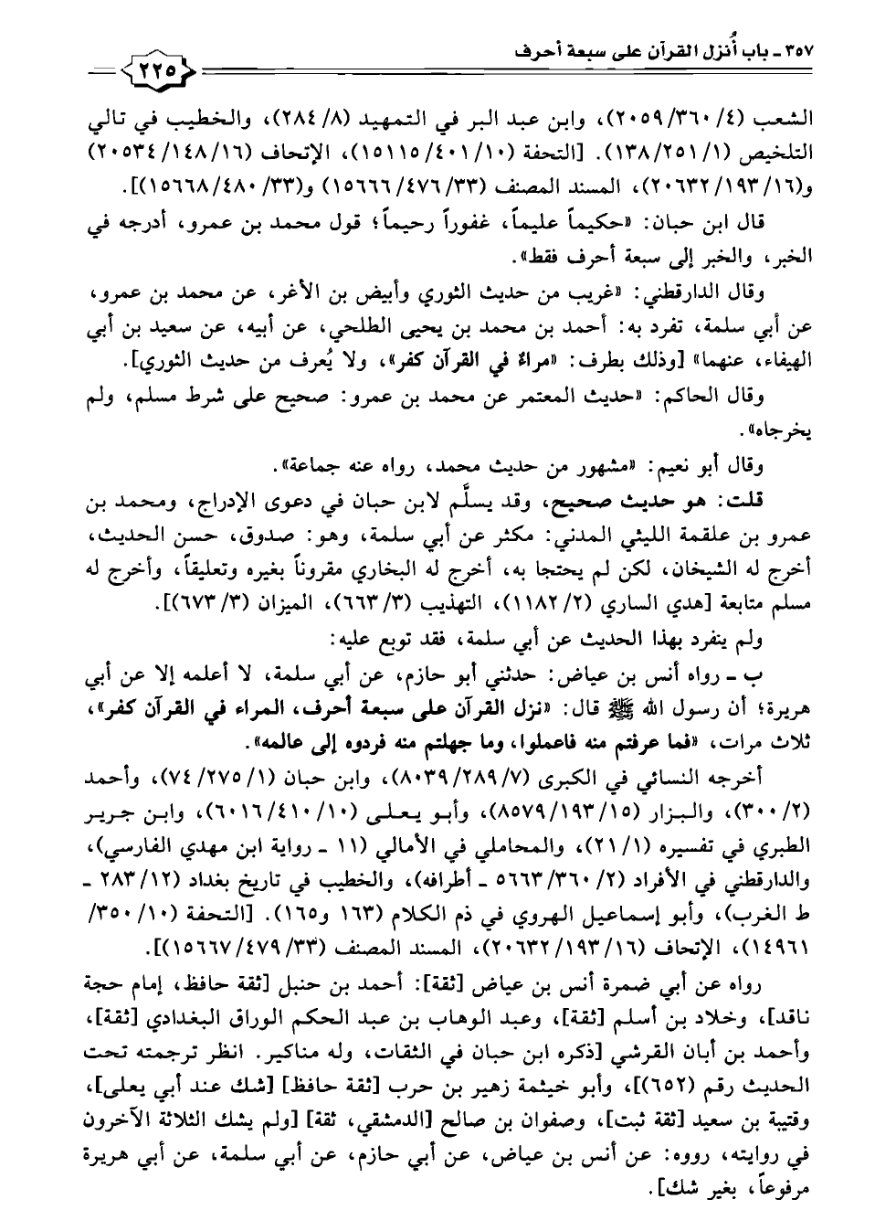 ب- رواه أنس بن عياض: حدثني أبو حازم، عن أبي سلمة، لا أعلمه إلا عن أبي هريرة؛ أن رسول الله -صلى الله عليه وسلم- قال: "نزل القرآن على سبعة أحرف، المراء في القرآن كفر"، ثلاث مرات، "فما عرفتم منه فاعملوا، وما جهلتم منه فردوه إلى عالمه ".