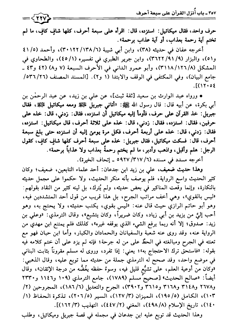• ورواه عبد الوارث بن سعيد [ثقة ثبت]؛ عن علي بن زيد، عن عبد الرحمن بن أبي بكرة، عن أبيه قال: قال رسول الله -صلى الله عليه وسلم-: "أتاني جبريل عليه السلام ومعه ميكائيل عليه السلام، فقال جبريل: خذ القرآن على حرف، فأومأ إليه ميكائيل أن استزده، فقال: زدني، قال: خذه على حرفين، فقال: استزده، فقال: زدني، قال: خذه على ثلاثة أحرف، قال ميكائيل: استزده، فقال: زدني، قال: خذه على أربعة أحرف، فكل مرة يومئ إليه أن استزده حتى بلغ سبعة أحرف، قال: فسكت ميكائيل، فقال جبريل: خذه على سبعة أحرف كلها شافٍ كافٍ، كقول الرجل: هلم وأقبل، واذهب وأدبر، ما لم يختم رحمة بعذاب ولا عذابًا برحمة ".