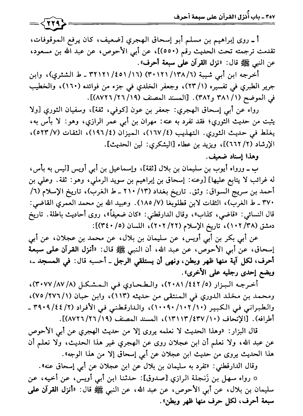 أ- روى إبراهيم بن مسلم أبو إسحاق الهجري [ضعيف، كان يرفع الموقوفات، تقدمت ترجمته تحت الحديث رقم (٥٥٠)]؛ عن أبي الأحوص، عن عبد الله بن مسعود، عن النبي -صلى الله عليه وسلم- قال: "نزل القرآن على سبعة أحرف".