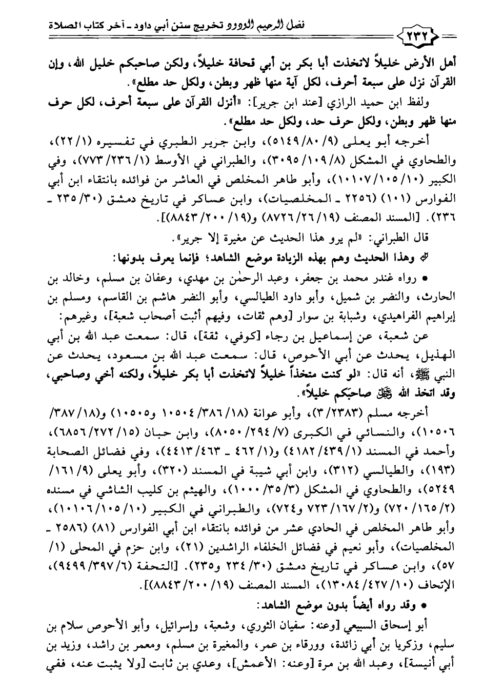 • رواه غندر محمد بن جعفر، وعبد الرحمن بن مهدي، وعفان بن مسلم، وخالد بن الحارث، والنضر بن شميل، وأبو داود الطيالسي، وأبو النضر هاشم بن القاسم، ومسلم بن إبراهيم الفراهيدي، وشبابة بن سوار [وهم ثقات، وفيهم أثبت أصحاب شعبة]، وغيرهم: عن شعبة، عن إسماعيل بن رجاء [كوفي، ثقة]؛ قال: سمعت عبد الله بن أبي الهذيل، يحدث عن أبي الأحوص، قال: سمعت عبد الله بن مسعود، يحدث عن النبي -صلى الله عليه وسلم-، أنه قال: "لو كنت متخذًا خليلًا لاتخذت أبا بكر خليلًا، ولكنه أخي وصاحبي، وقد أتخذ الله -عزَّ وجلَّ-صاحبَكم خليلًا".