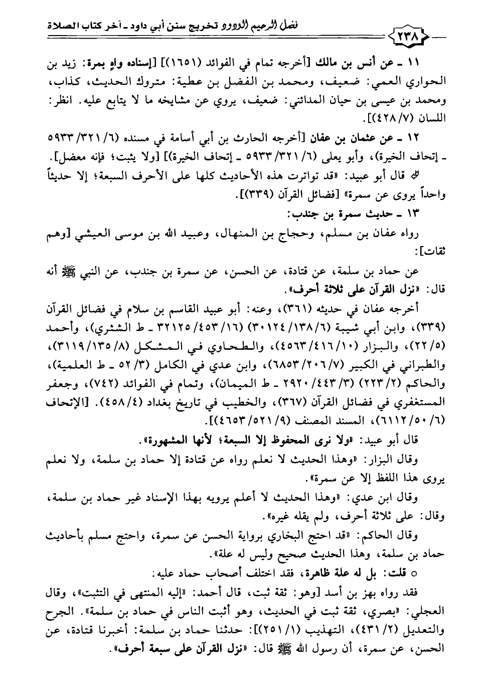 * قال أبو عبيد: "قد تواترت هذه الأحاديث كلها على الأحرف السبعة، إلا حديثًا واحداً يروى عن سمرة" [فضائل القرآن (٣٣٩)].