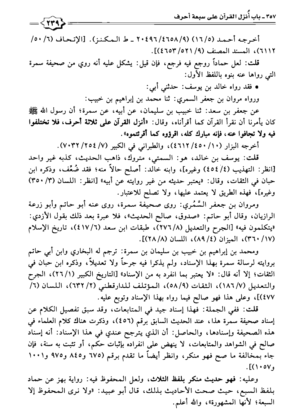 قلت: لعل حمادأ روجع فيه فرجع، فإن قيل: يشكل عليه أنه روي من صحيفة سمرة التي رواها عنه بنوه باللفظ الأول: