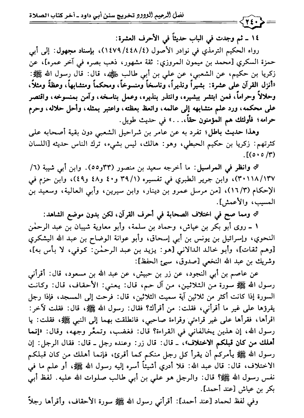 ١٤ - ثم وجدت في الباب حديثًا في الأحرف العشرة: