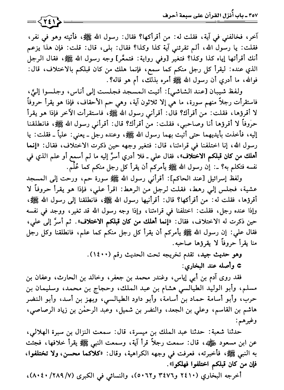 حدثنا شعبة: حدثنا عبد الملك بن ميسرة، قال: سمعت النزال بن سبرة الهلالي، عن ابن مسعود -رضي الله عنه-، قال: سمعت رجلًا قرأ آية، وسمعت النبي -صلى الله عليه وسلم- يقرأ خلافها، فجئت به النبي -صلى الله عليه وسلم-، فأخبرته، فعرفت في وجهه الكراهية، وقال: "كلاكما محسن، ولا تختلفوا، فإن من كان قبلكم اختلفوا فهلكوا".