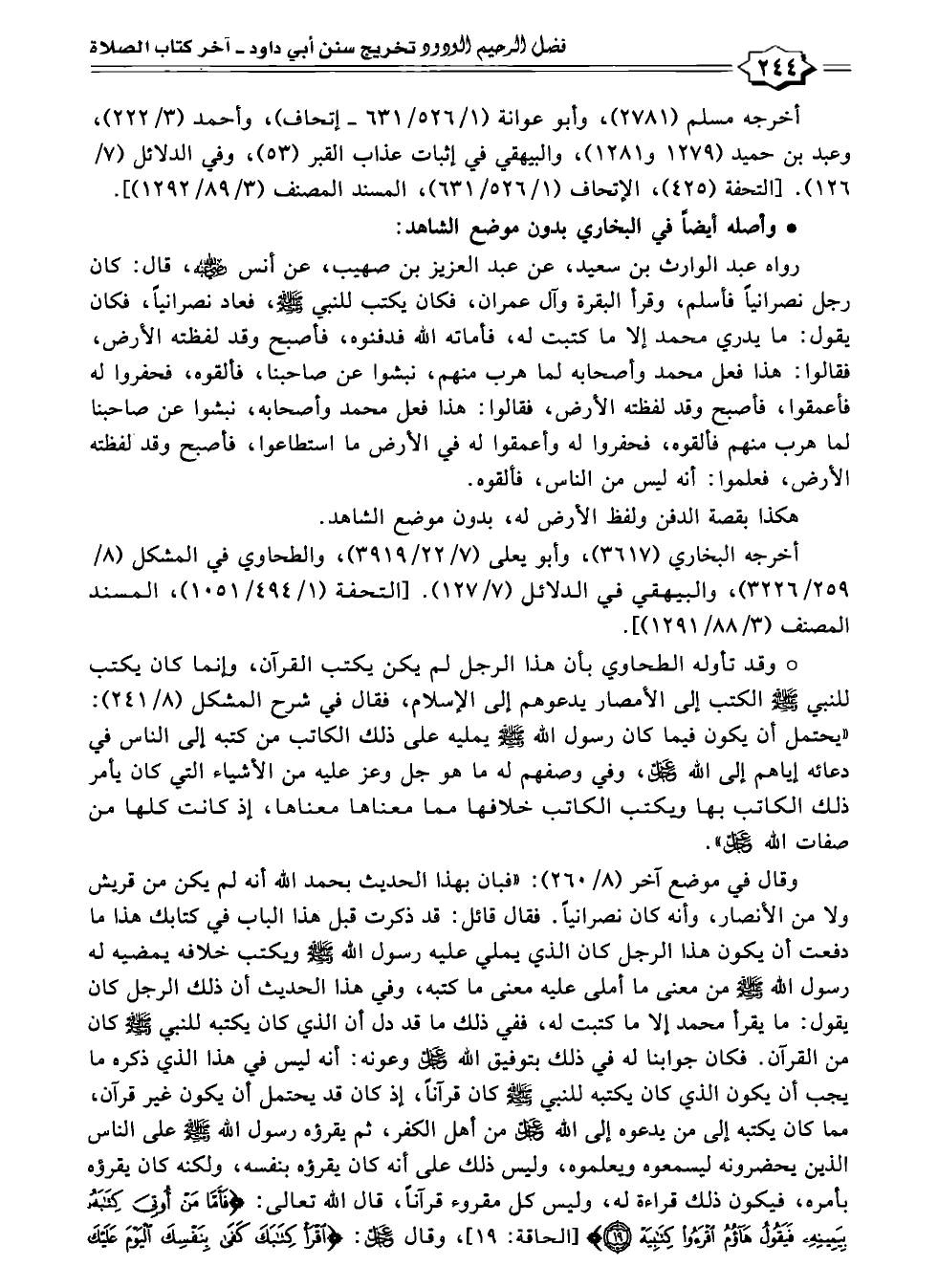 وقال في موضع آخر (٨/ ٢٦٠): "فبان بهذا الحديث بحمد الله أنه لم يكن من قريش ولا من الأنصار، وأنه كان نصرانيًا. فقال قائل: قد ذكرت قبل هذا الباب في كتابك هذا ما دفعت أن يكون هذا الرجل كان الذي يملي عليه رسول الله -صلى الله عليه وسلم- ويكتب خلافه يمضيه له رسول الله -صلى الله عليه وسلم- من معنى ما أملى عليه معنى ما كتبه، وفي هذا الحديث أن ذلك الرجل كان يقول: ما يقرأ محمد إلا ما كتبت له، ففي ذلك ما قد دل أن الذي كان يكتبه للنبي -صلى الله عليه وسلم- كان من القرآن. فكان جوابنا له في ذلك بتوفيق الله -عزَّ وجلَّ- وعونه: أنه ليس في هذا الذي ذكره ما يجب أن يكون الذي كان يكتبه للنبي -صلى الله عليه وسلم- كان قرآنًا، إذ كان قد يحتمل أن يكون غير قرآن، مما كان يكتبه إلى من يدعوه إلى الله -عزَّ وجلَّ- من أهل الكفر، ثم يقرؤه رسول الله -صلى الله عليه وسلم- على الناس الذين يحضرونه ليسمعوه ويعلموه، وليس ذلك على أنه كان يقرؤه بنفسه، ولكنه كان يقرؤه بامره، فيكون ذلك قراءة له، وليس كل مقروء قرآنًا، قال الله تعالى: {فَأَمَّا مَنْ أُوتِيَ كِتَابَهُ بِيَمِينِهِ فَيَقُولُ هَاؤُمُ اقْرَءُوا كِتَابِيَهْ (١٩)} [الحاقة: ١٩] وقال عزَّ وجلَّ: {اقْرَأْ كِتَابَكَ كَفَى بِنَفْسِكَ الْيَوْمَ عَلَيْكَ