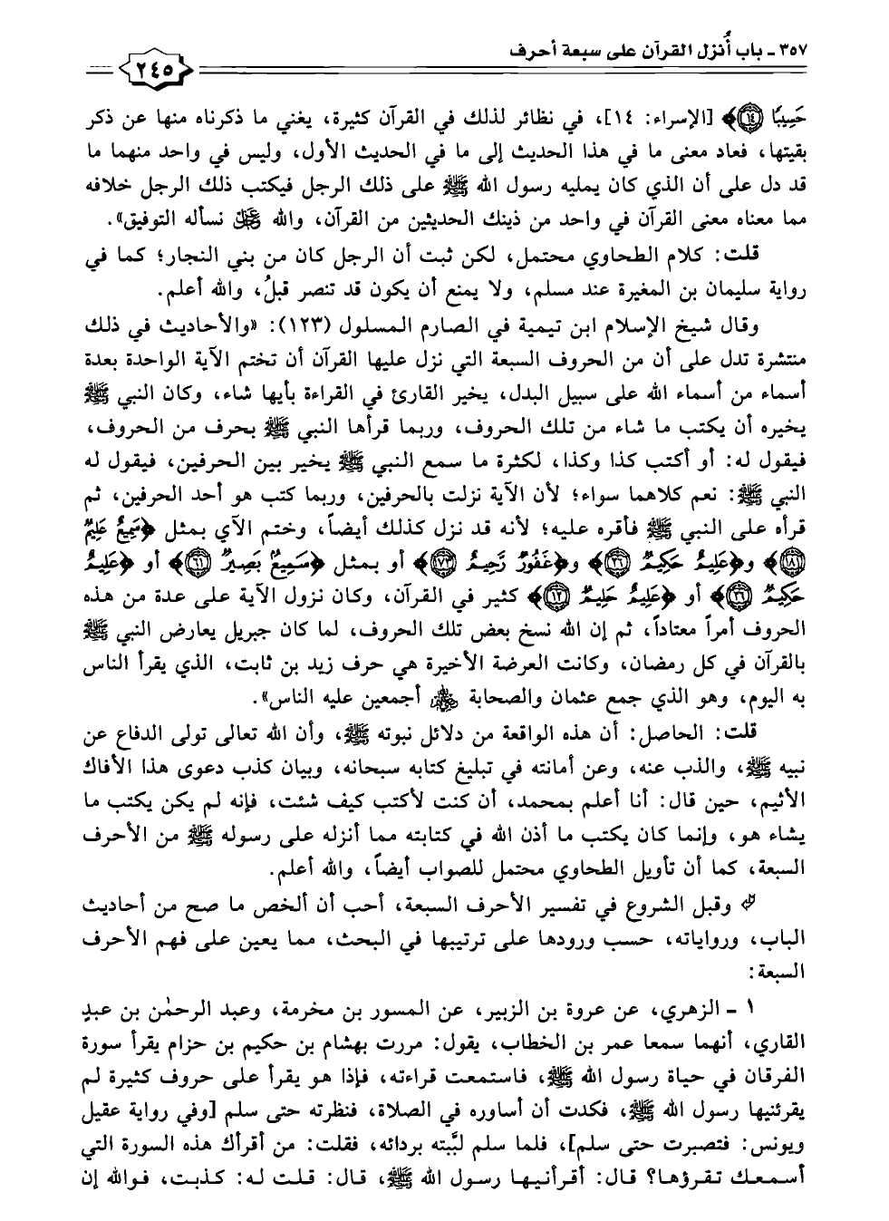 وقال شيخ الإسلام ابن تيمية في الصارم المسلول (١٢٣): "والأحاديث في ذلك منتشرة تدل على أن من الحروف السبعة التي نزل عليها القرآن أن تختم الآية الواحدة بعدة أسماء من أسماء الله على سبيل البدل، يخير القارئ في القراءة بأيها شاء، وكان النبي -صلى الله عليه وسلم- يخيره أن يكتب ما شاء من تلك الحروف، وربما قرأها النبي -صلى الله عليه وسلم- بحرف من الحروف، فيقول له: أو أكتب كذا وكذا، لكثرة ما سمع النبي -صلى الله عليه وسلم- يخير بين الحرفين، فيقول له النبي -صلى الله عليه وسلم-: نعم كلاهما سواء؛ لأن الآية نزلت بالحرفين، وربما كتب هو أحد الحرفين، ثم قرأه على النبي -صلى الله عليه وسلم- فأقره عليه؛ لأنه قد نزل كذلك أيضًا، وختم الآي بمثل {سَمِيعٌ عَلِيمٌ (١٨١)} و {عَلِيمٌ حَكِيمٌ (٢٦)} و {غَفُورٌ رَحِيمٌ (١٧٣)} أو بمثل {سَمِيعٌ بَصِيرٌ (٦١)} أو {عَلِيمٌ حَكِيمٌ (٢٦)} " أو {عَلِيمٌ حَلِيمٌ (١٢)} كثير في القرآن، وكان نزول الآية على عدة من هذه الحروف أمرًا معتادًا، ثم إن الله نسخ بعض تلك الحروف، لما كان جبريل يعارض النبي -صلى الله عليه وسلم- بالقرآن في كل رمضان، وكانت العرضة الأخيرة هي حرف زيد بن ثابت، الذي يقرأ الناس به اليوم، وهو الذي جمع عثمان والصحابة -رضي الله عنهم- أجمعين عليه الناس".