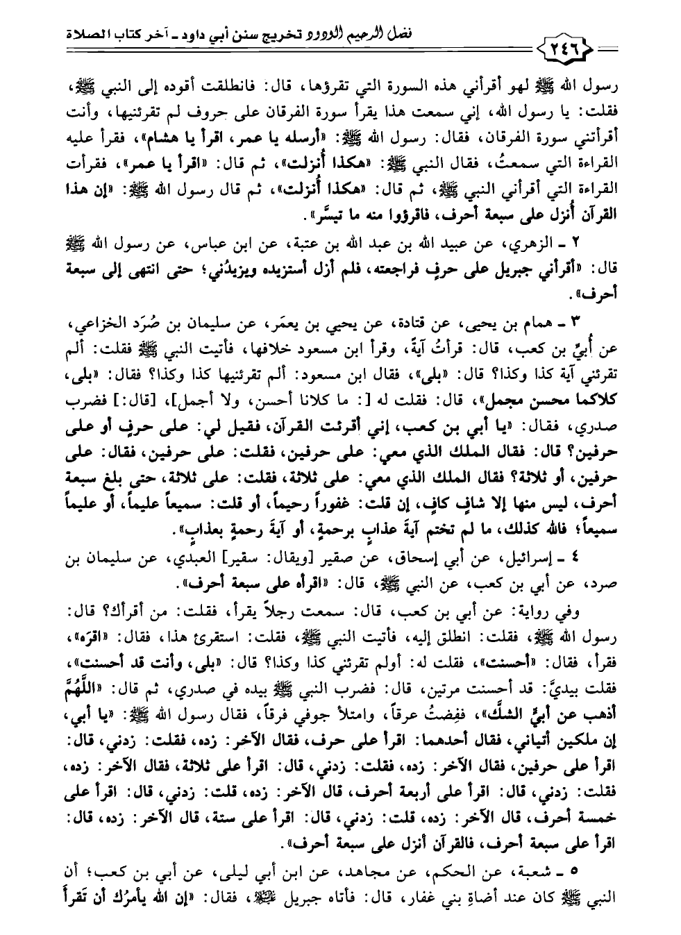 ٣ - همام بن يحيى، عن قتادة، عن يحيي بن يعمَر، عن سليمان بن صُرَد الخزاعي، عن أُبيِّ بن كعب، قال: قرأتُ آيةً، وقرأ ابن مسعود خلافها، فأتيت النبي -صلى الله عليه وسلم- فقلت: ألم تقرئني آية كذا وكذا؟ قال: "بلى"، فقال ابن مسعود: ألم تقرئنيها كذا وكذا؟ فقال: "بلى، كلاكما محسن مجمل "، قال: فقلت له [: ما كلانا أحسن، ولا أجمل]، [قال:] فضرب صدري، فقال: "يا أبي بن كعب، إني أقرئت القرآن، فقيل لي: على حرفٍ أو على حرفين؟ قال: فقال الملك الذي معي: على حرفين، فقلت: على حرفين، فقال: على حرفين، أو ثلاثة؟ فقال الملك الذي معي: على ثلاثة، فقلت: على ثلاثة، حتى بلغ سبعة أحرف، ليس منها إلا شافٍ كافٍ، إن قلت: غفورًا رحيمًا، أو قلت: سميعًا عليمًا، أو عليمًا سميعًا؛ فالله كذلك، ما لم تختم آيةَ عذابٍ برحمةٍ، أو آيةَ رحمةٍ بعدابٍ ".