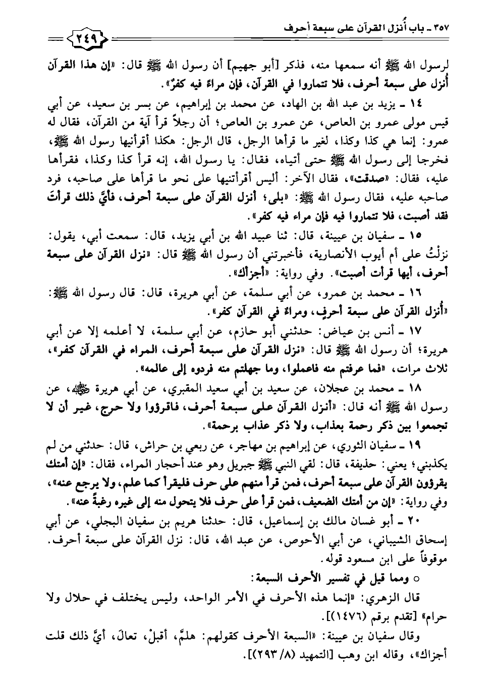 قال الزهري: "إنما هذه الأحرف في الأمر الواحد، وليس يختلف في حلال ولا حرام " [تقدم برقم (١٤٧٦)].