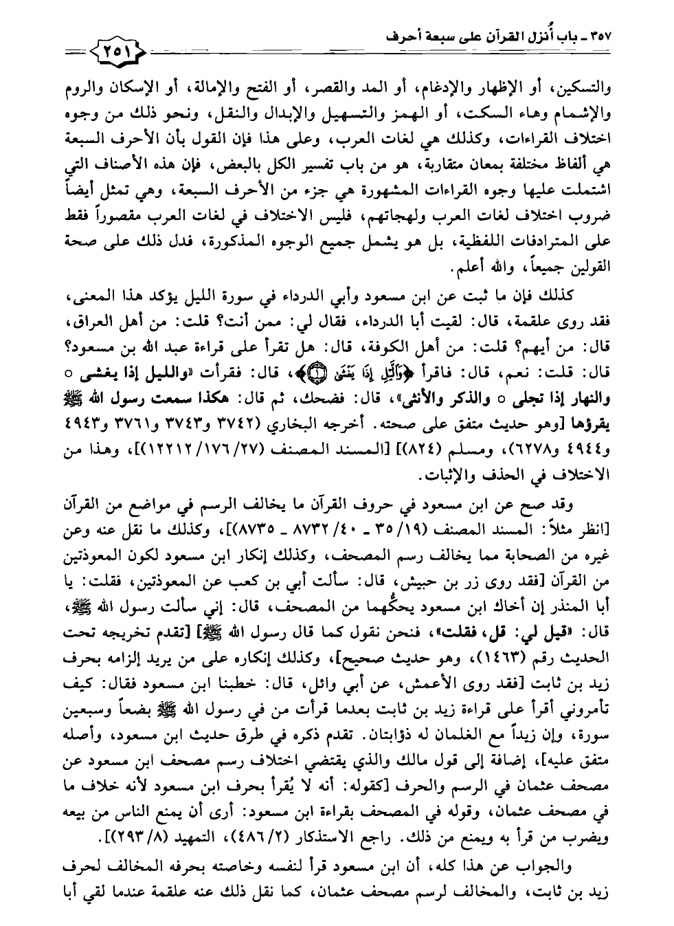 كذلك فإن ما ثبت عن ابن مسعود وأبي الدرداء في سورة الليل يؤكد هذا المعنى، فقد روى علقمة، قال: لقيت أبا الدرداء، فقال لي: ممن أنت؟ قلت: من أهل العراق، قال: من أيهم؟ قلت: من أهل الكوفة، قال: هل تقرأ على قراءة عبد الله بن مسعود؟ قال: قلت: نعم، قال: فاقرأ {وَاللَّيْلِ إِذَا يَغْشَى (١)}، قال: فقرأت "والليل إدْا يغشى والنهار إذا تجلى "والذكر والأنثى "، قال: فضحك، ثم قال: هكذا سمعت رسول الله -صلى الله عليه وسلم- يقرؤها [وهو حديث متفق على صحته. أخرجه البخاري (٣٧٤٢ و ٣٧٤٣ و ٣٧٦١ و ٤٩٤٣ و ٤٩٤٤ و ٦٢٧٨)، ومسلم (٨٢٤)، [المسند المصنف (٢٧/ ١٧٦/ ١٢٢١٢)]؛ وهذا من الاختلاف في الحذف والإثبات.