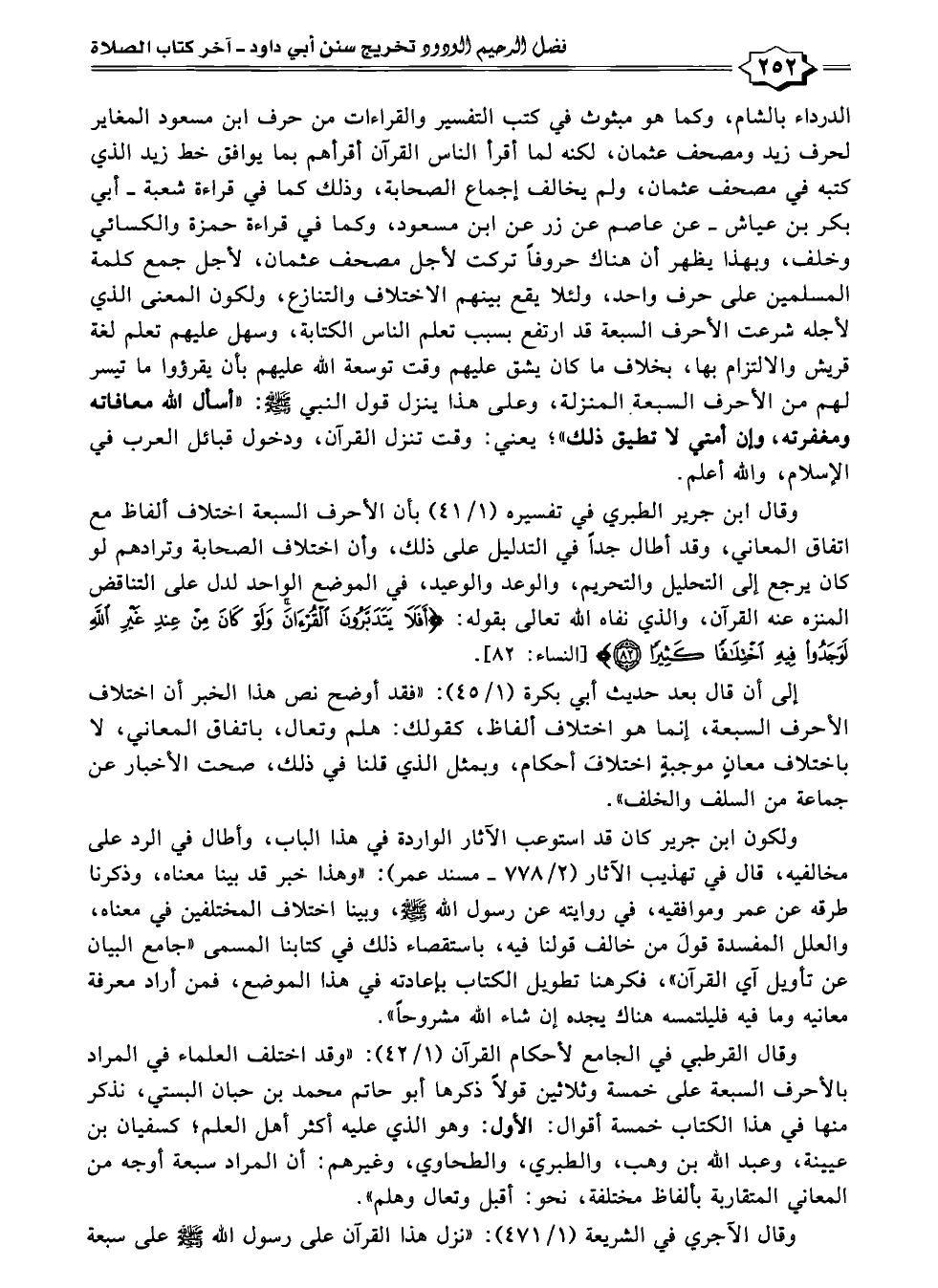 وقال ابن جرير الطبري في تفسيره (١/ ٤١) بأن الأحرف السبعة اختلاف ألفاظ مع اتفاق المعاني، وقد أطال جدًا في التدليل على ذلك، وأن اختلاف الصحابة وترادهم لو كان يرجع إلى التحليل والتحريم، والوعد والوعيد، في الموضع الواحد لدل على التناقض المنزه عنه القرآن، والذي نفاه الله تعالى بقوله: {أَفَلَا يَتَدَبَّرُونَ الْقُرْآنَ وَلَوْ كَانَ مِنْ عِنْدِ غَيْرِ اللَّهِ لَوَجَدُوا فِيهِ اخْتِلَافًا كَثِيرًا (٨٢)} [النساء: ٨٢].