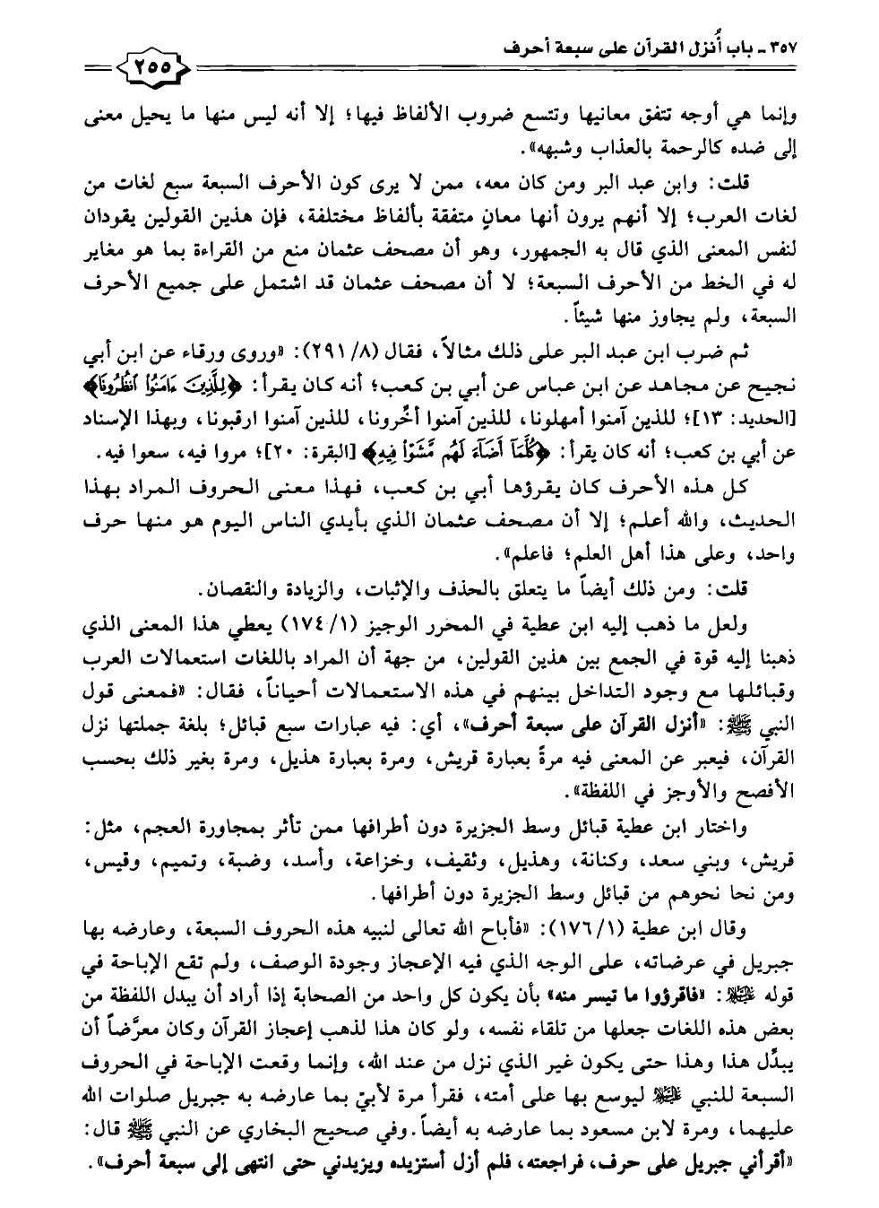 قلت: وابن عبد البر ومن كان معه، ممن لا يرى كون الأحرف السبعة سبع لغات من لغات العرب؛ إلا أنهم يرون أنها معانٍ متفقة بألفاظ مختلفة، فإن هذين القولين يقودان لنفس المعنى الذي قال به الجمهور، وهو أن مصحف عثمان منع من القراءة بما هو مغاير له في الخط من الأحرف السبعة؛ لا أن مصحف عثمان قد اشتمل على جميع الأحرف السبعة، ولم يجاوز منها شيئًا.
