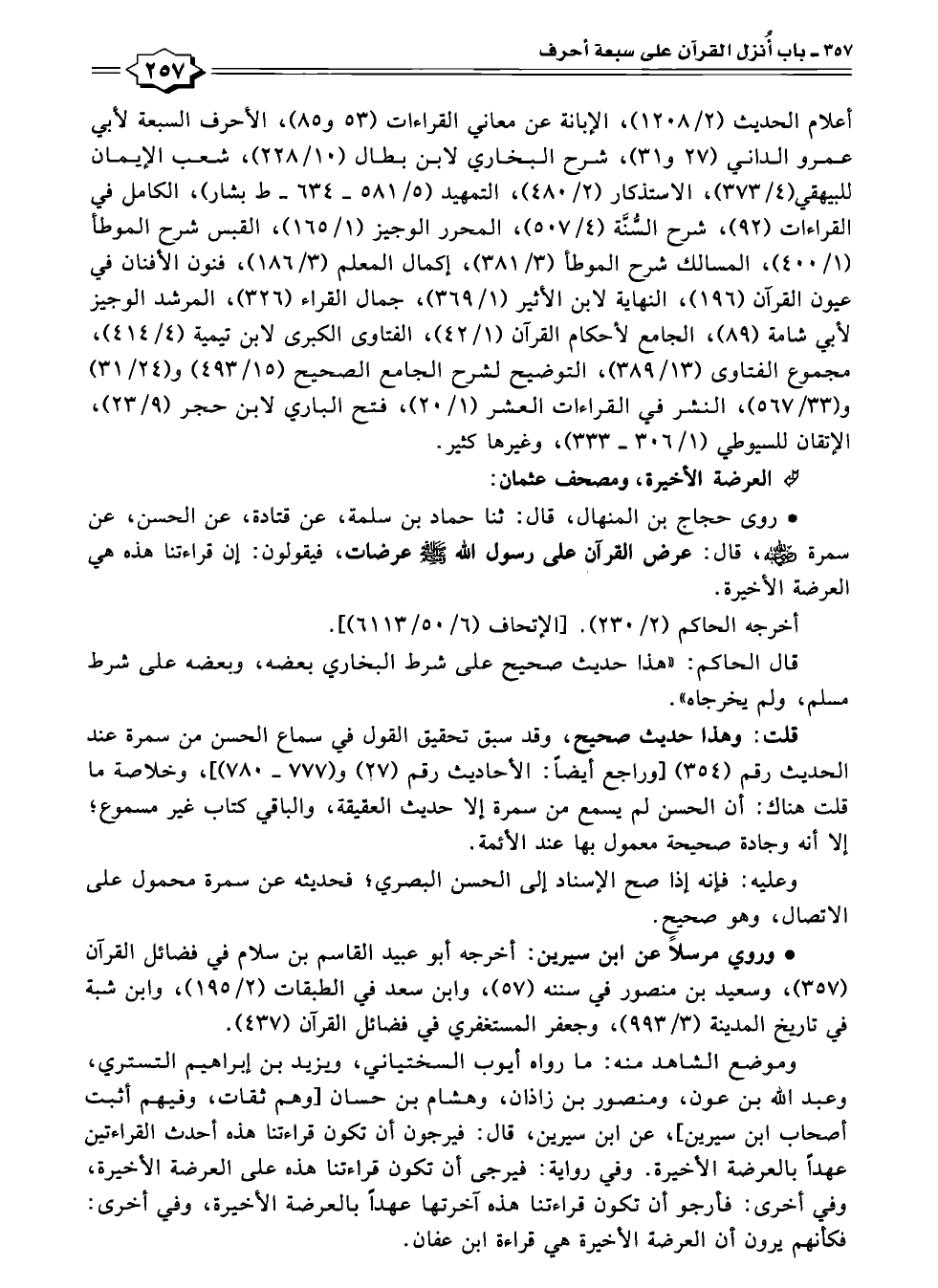 وموضع الشاهد منه: ما رواه أيوب السختياني، ويزيد بن إبراهيم التستري، وعبد الله بن عون، ومنصور بن زاذان، وهشام بن حسان [وهم ثقات، وفيهم أثبت أصحاب ابن سيرين]؛ عن ابن سيرين، قال: فيرجون أن تكون قراءتنا هذه أحدث القراءتين عهدًا بالعرضة الأخيرة. وفي رواية: فيرجى أن تكون قراءتنا هذه على العرضة الأخيرة، وفي أخرى: فأرجو أن تكون قراءتنا هذه آخرتها عهدًا بالعرضة الأخيرة، وفي أخرى: فكأنهم يرون أن العرضة الأخيرة هي قراءة ابن عفان.