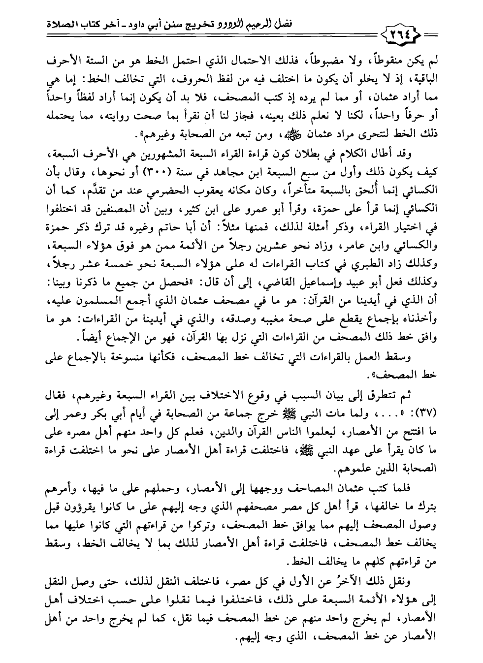 لم يكن منقوطًا، ولا مضبوطًا، فذلك الاحتمال الذي احتمل الخط هو من الستة الأحرف الباقية، إذ لا يخلو أن يكون ما اختلف فيه من لفظ الحروف، التي تخالف الخط: إما هي مما أراد عثمان، أو مما لم يرده إذ كتب المصحف، فلا بد أن يكون إنما أراد لفظًا واحدًا أو حرفًا واحدًا، لكنا لا نعلم ذلك بعينه، فجاز لنا أن نقرأ بما صحت روايته، مما يحتمله ذلك الخط لنتحرى مراد عثمان - رضي الله عنه -، ومن تبعه من الصحابة وغيرهم".