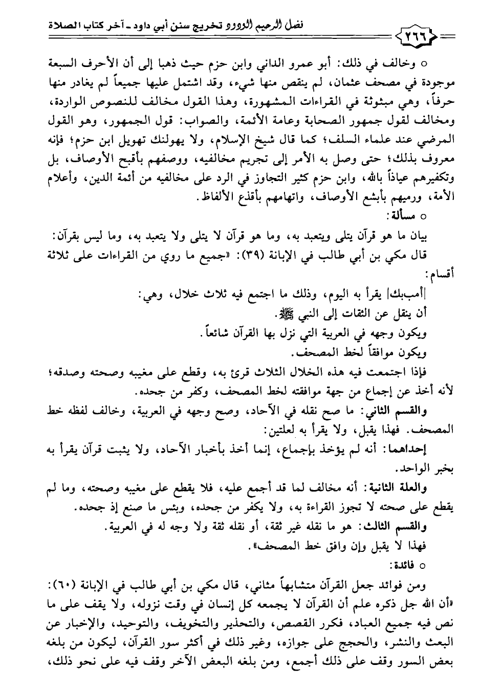 بيان ما هو قرآن يتلى ويتعبد به، وما هو قرآن لا يتلى ولا يتعبد به، وما ليس بقرآن: قال مكي بن أبي طالب في الإبانة (٣٩): "جميع ما روي من القراءات على ثلاثة أقسام: