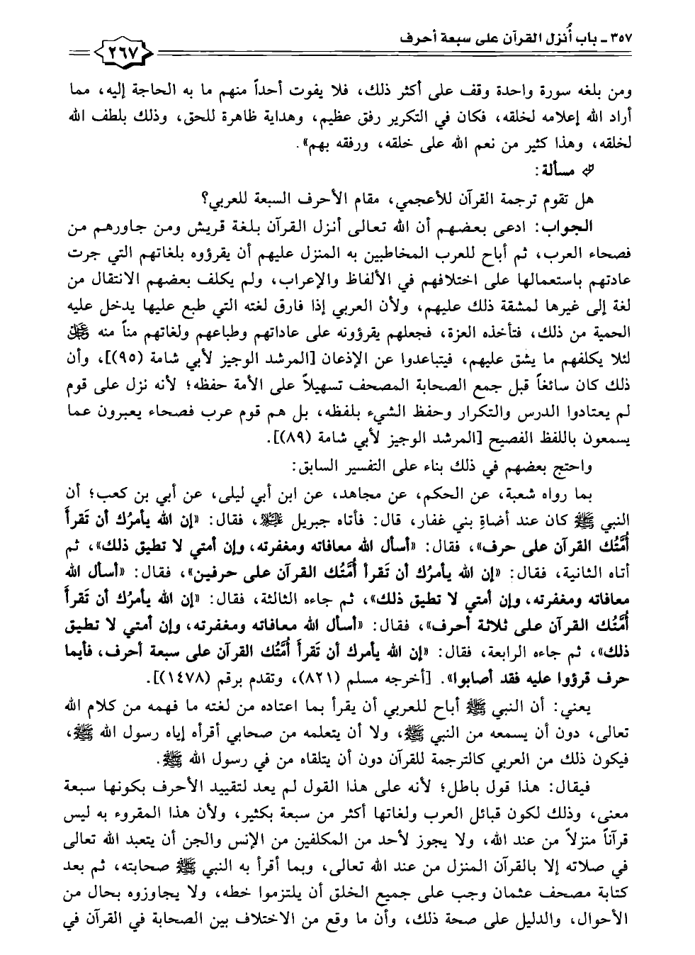 بما رواه شعبة، عن الحكم، عن مجاهد، عن ابن أبي ليلى، عن أبي بن كعب؛ أن النبي - صلى الله عليه وسلم - كان عند أضاةِ بني غفار، قال: فأتاه جبريل عليه السلام، فقال: "إن الله يأمرُك أن تَقرأَ أُمَّتُك القرآن على حرف"، فقال: "أسأل الله معافاته ومغفرته، وإن أمتي لا تطيق ذلك"، ثم أتاه الثانية، فقال: "إن الله يأمرُك أن تَقرأ أُمَّتُك القرآن على حرفين"، فقال: "أسأل الله معافاته ومغفرته، وإن أمتي لا تطيق ذلك"، ثم جاءه الثالثة، فقال: "إن الله يأمرُك أن تَقرأَ أُمَّتُك القرآن على ثلاثة أحرف"، فقال: "أسأل الله معافاته ومغفرته، وإن أمتي لا تطيق ذلك"، ثم جاءه الرابعة، فقال: "إن اللّه يأمرك أن تَقرأَ أُمَّتُك القرآن على سبعة أحرف، فأيما حرف قرؤوا عليه فقد أصابوا". [أخرجه مسلم (٨٢١)، وتقدم برقم (١٤٧٨)].