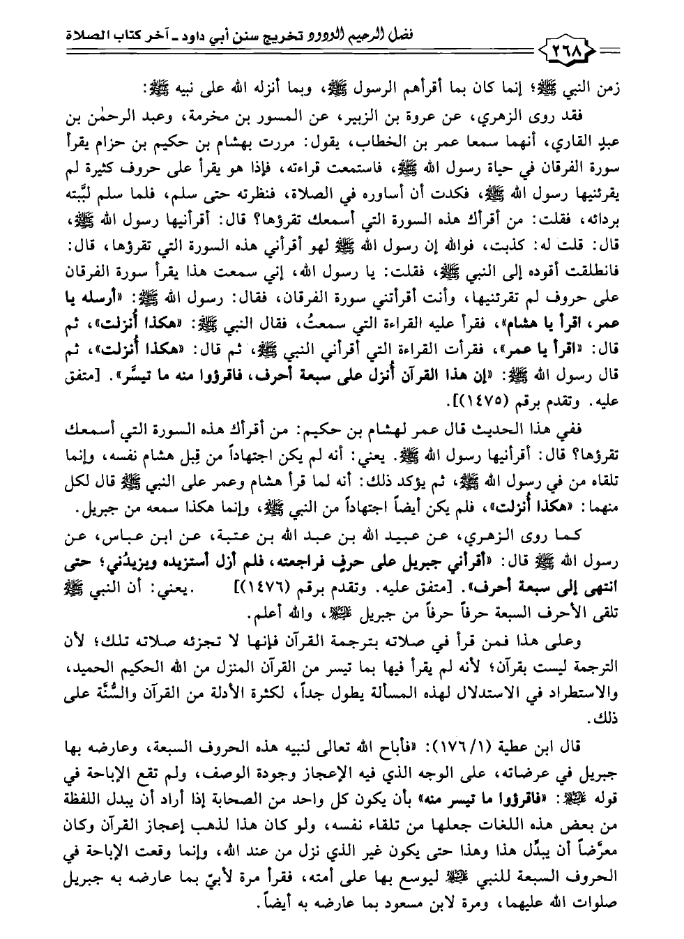 فقد روى الزهري، عن عروة بن الزبير، عن المسور بن مخرمة، وعبد الرحمن بن عبدٍ القاري، أنهما سمعا عمر بن الخطاب، يقول: مررت بهشام بن حكيم بن حزام يقرأ سورة الفرقان في حياة رسول الله - صلى الله عليه وسلم -، فاستمعت قراءته، فإذا هو يقرأ على حروف كثيرة لم يقرئنيها رسول الله - صلى الله عليه وسلم -، فكدت أن أساوره في الصلاة، فنظرته حتى سلم، فلما سلم لبَّبته بردائه، فقلت: من أقرأك هذه السورة التي أسمعك تقرؤها؟ قال: أقرأنيها رسول الله - صلى الله عليه وسلم -، قال: قلت له: كذبت، فواللّه إن رسول اللّه - صلى الله عليه وسلم - لهو أقرأني هذه السورة التي تقرؤها، قال: فانطلقت أقوده إلى النبي - صلى الله عليه وسلم -، فقلت: يا رسول الله، إني سمعت هذا يقرأ سورة الفرقان على حروف لم تقرئنيها، وأنت أقرأتني سورة الفرقان، فقال: رسول الله - صلى الله عليه وسلم -: "أرسله يا عمر، اقرأ يا هشام"، فقرأ عليه القراءة التي سمعتُ، فقال النبي - صلى الله عليه وسلم -: "هكذا أُنزلت"، ثم قال: "اقرأ يا عمر"، فقرأت القراءة التي أقرأني النبي - صلى الله عليه وسلم -،- ثم قال: "هكذا أُنزلت"، ثم قال رسول الله - صلى الله عليه وسلم -: "إن هذا القرآن أُنزل على سبعة أحرف، فاقرؤوا منه ما تيسَّر". [متفق عليه. وتقدم برقم (١٤٧٥)].