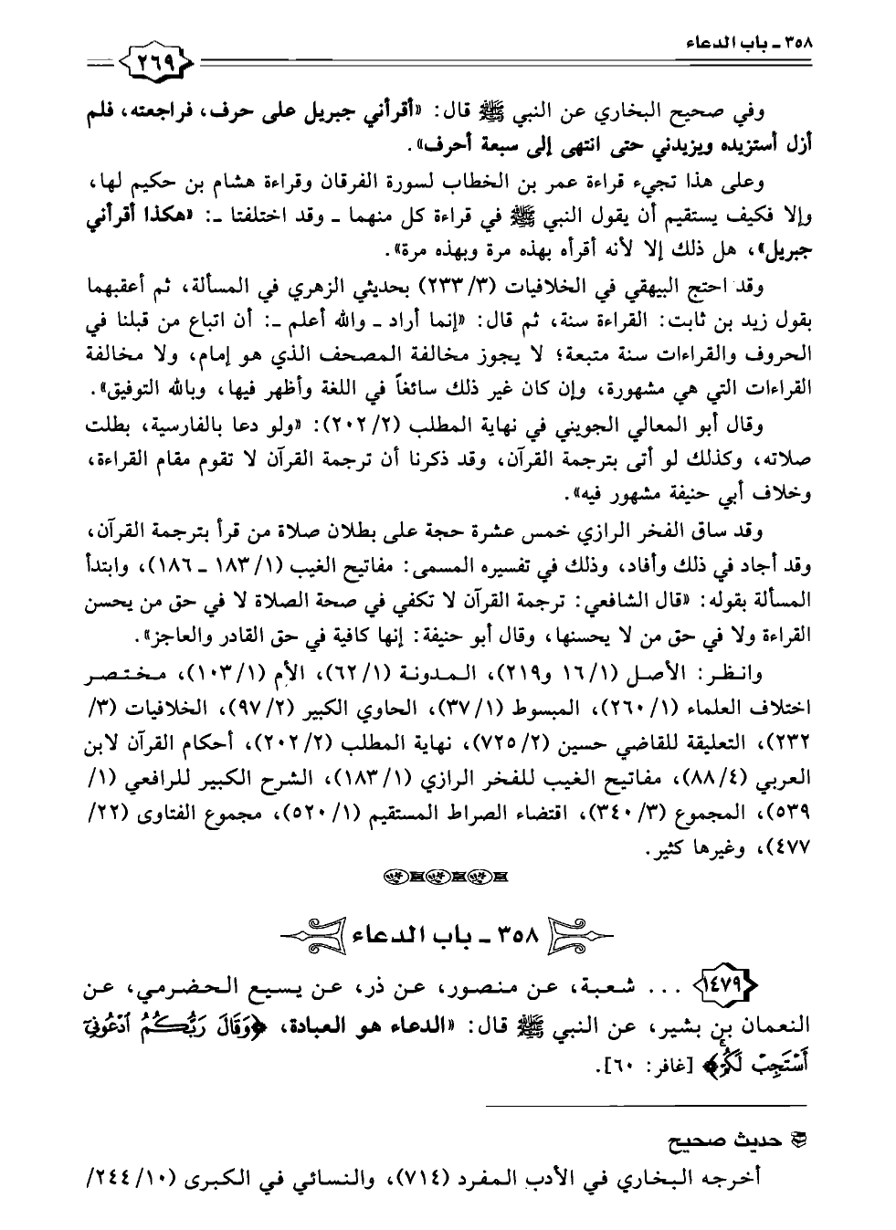 ١٤٧٩ - . . . شعبة، عن منصور، عن ذر، عن يسيع الحضرمي، عن النعمان بن بشير، عن النبي - صلى الله عليه وسلم - قال: "الدعاء هو العبادة، {وَقَالَ رَبُّكُمُ ادْعُونِي أَسْتَجِبْ لَكُمْ} [غافر: ٦٠].