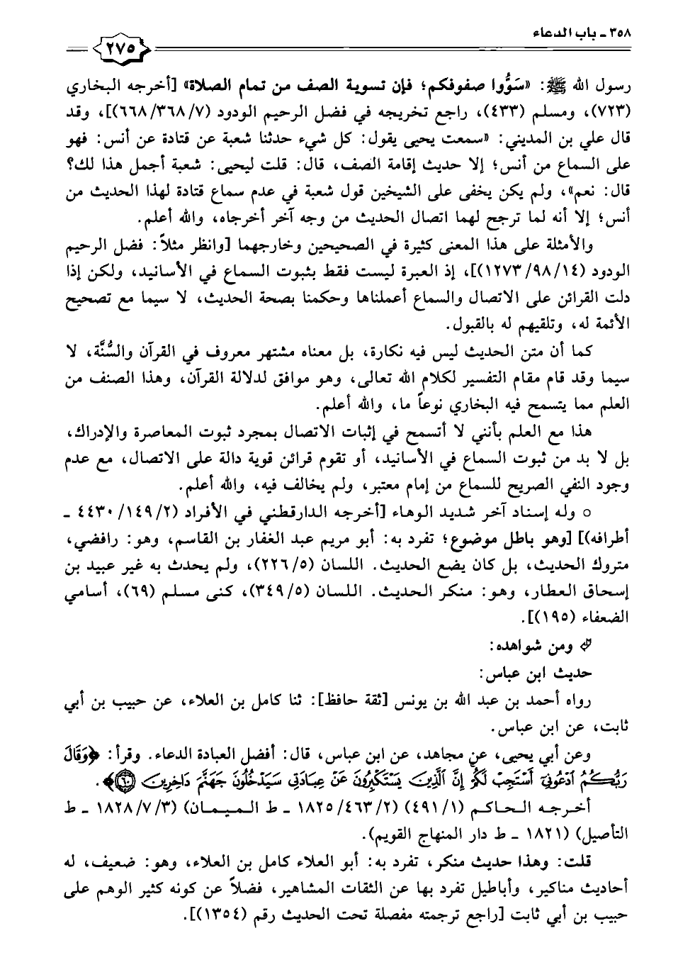 رسول الله - صلى الله عليه وسلم -: "سَوُّوا صفوفكم؛ فإن تسوية الصف من تمام الصلاة" [أخرجه البخاري (٧٢٣)، ومسلم (٤٣٣)، راجع تخريجه في فضل الرحيم الودود (٧/ ٣٦٨/ ٦٦٨)]، وقد قال علي بن المديني: "سمعت يحيى يقول: كل شيء حدثنا شعبة عن قتادة عن أنس: فهو على السماع من أنس؛ إلا حديث إقامة الصف، قال: قلت ليحيى: شعبة أجمل هذا لك؟ قال: نعم"، ولم يكن يخفى على الشيخين قول شعبة في عدم سماع قتادة لهذا الحديث من أنس؛ إلا أنه لما ترجح لهما اتصال الحديث من وجه آخر أخرجاه، والله أعلم.
