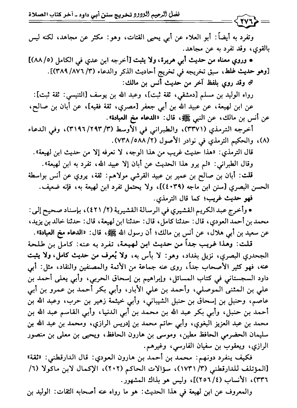 • وأخرج عبد الكريم القشيري في الرسالة القشيرية (٢/ ٤٢١)، بإسناد صحيح إلى: محمد بن أحمد العودي، قال: حدثنا كامل، قال: حدثنا ابن لهيعة، قال: حدثنا خالد بن يزيد، عن سعيد بن أبي هلال، عن أنس بن مالك؛ أن رسول الله - صلى الله عليه وسلم -، قال: "الدعاء مخ العبادة".