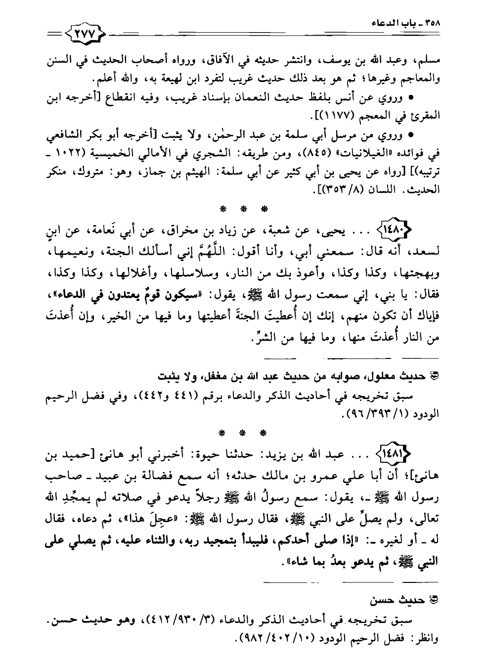 ١٤٨٠ - . . . يحيى، عن شعبة، عن زياد بن مخراق، عن أبي نَعامة، عن ابنٍ لسعد، أنه قال: سمعني أبي، وأنا أقول: اللَّهُمَّ إني أسألك الجنة، ونعيمها، وبهجتها، وكذا وكذا، وأعوذ بك من النار، وسلاسلها، وأغلالها، وكذا وكذا، فقال: يا بني، إني سمعت رسول اللّه - صلى الله عليه وسلم -، يقول: "سيكون قومٌ يعتدون في الدعاء"، فإياك أن تكون منهم، إنك إن أُعطيتَ الجنةَ أعطيتها وما فيها من الخير، وإن أُعذتَ من النار أُعذتَ منها، وما فيها من الشرِّ.