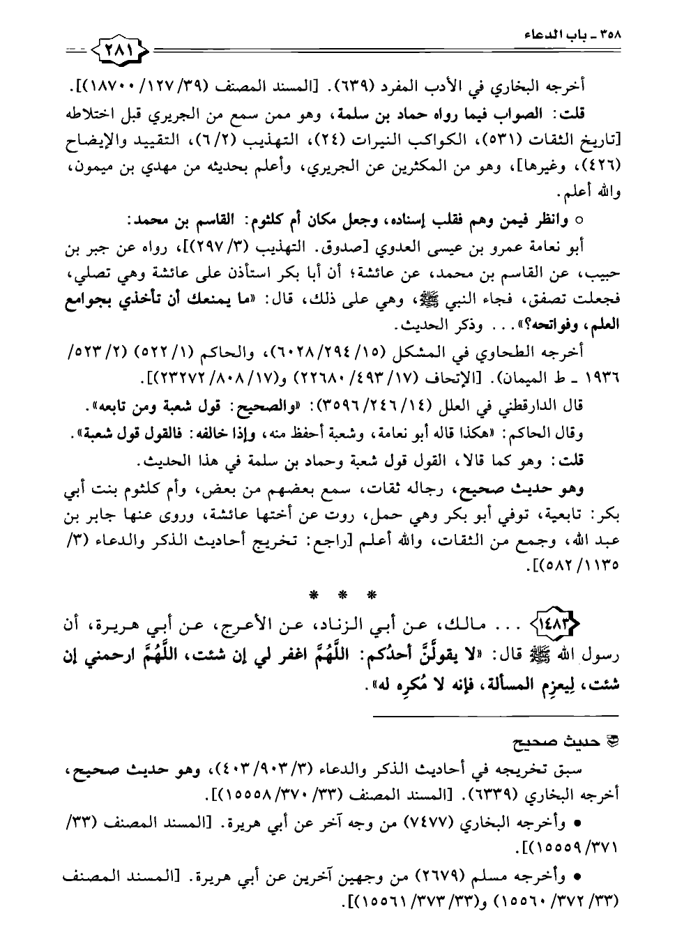١٤٨٣ - . . . مالك، عن أبي الزناد، عن الأعرج، عن أبي هريرة، أن رسول اللّه - صلى الله عليه وسلم - قال: "لا يقولَّنَّ أحدُكم: اللَّهُمَّ اغفر لي إن شئت، اللَّهُمَّ ارحمني إن شئت، لِيعزِم المسألة، فإنه لا مُكرِه له".