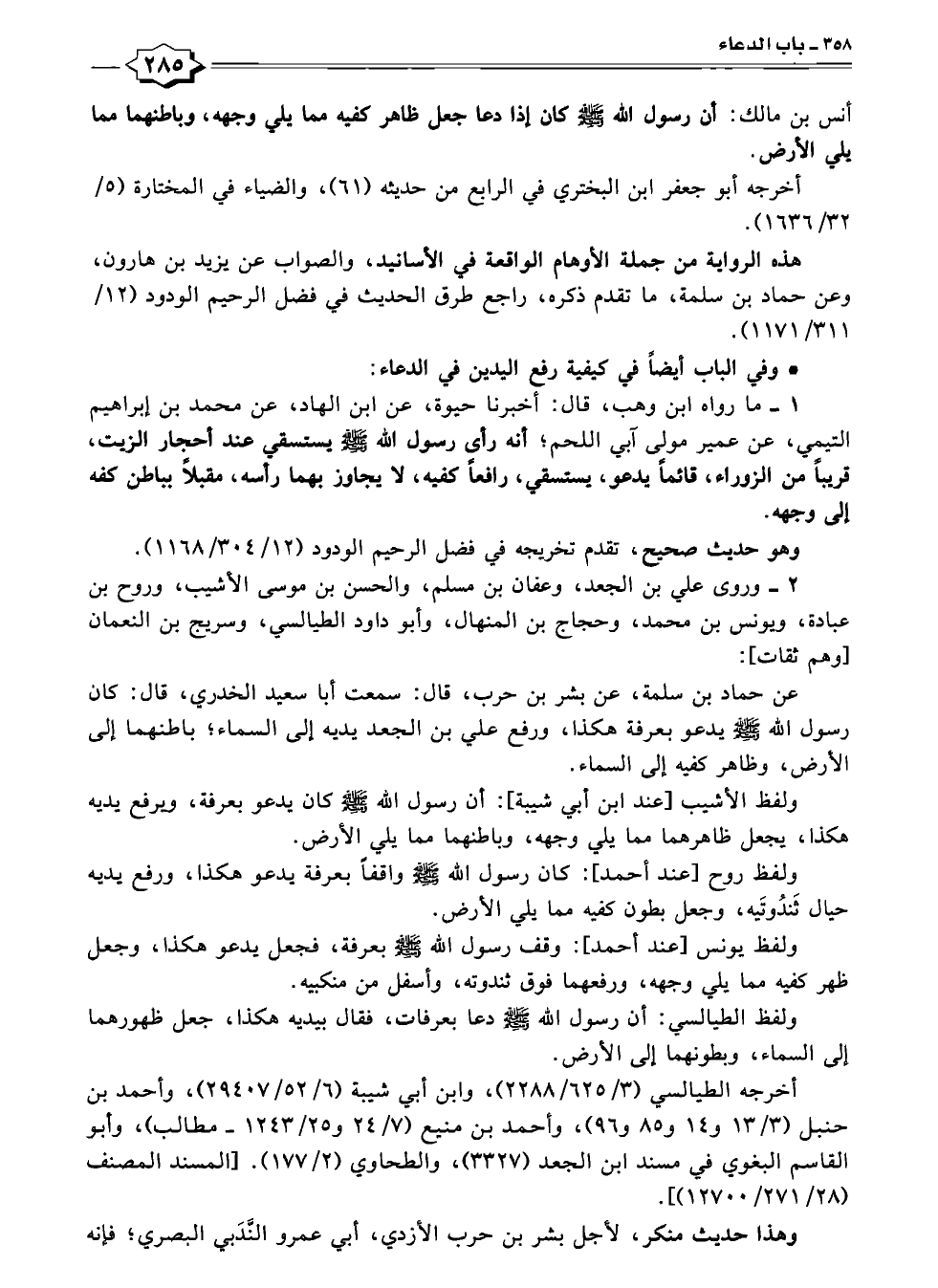 ولفظ روح [عند أحمد]: كان رسول الله - صلى الله عليه وسلم - واقفًا بعرفة يدعو هكذا، ورفع يديه حيال ثَندُوتَيه، وجعل بطون كفيه مما يلي الأرض.