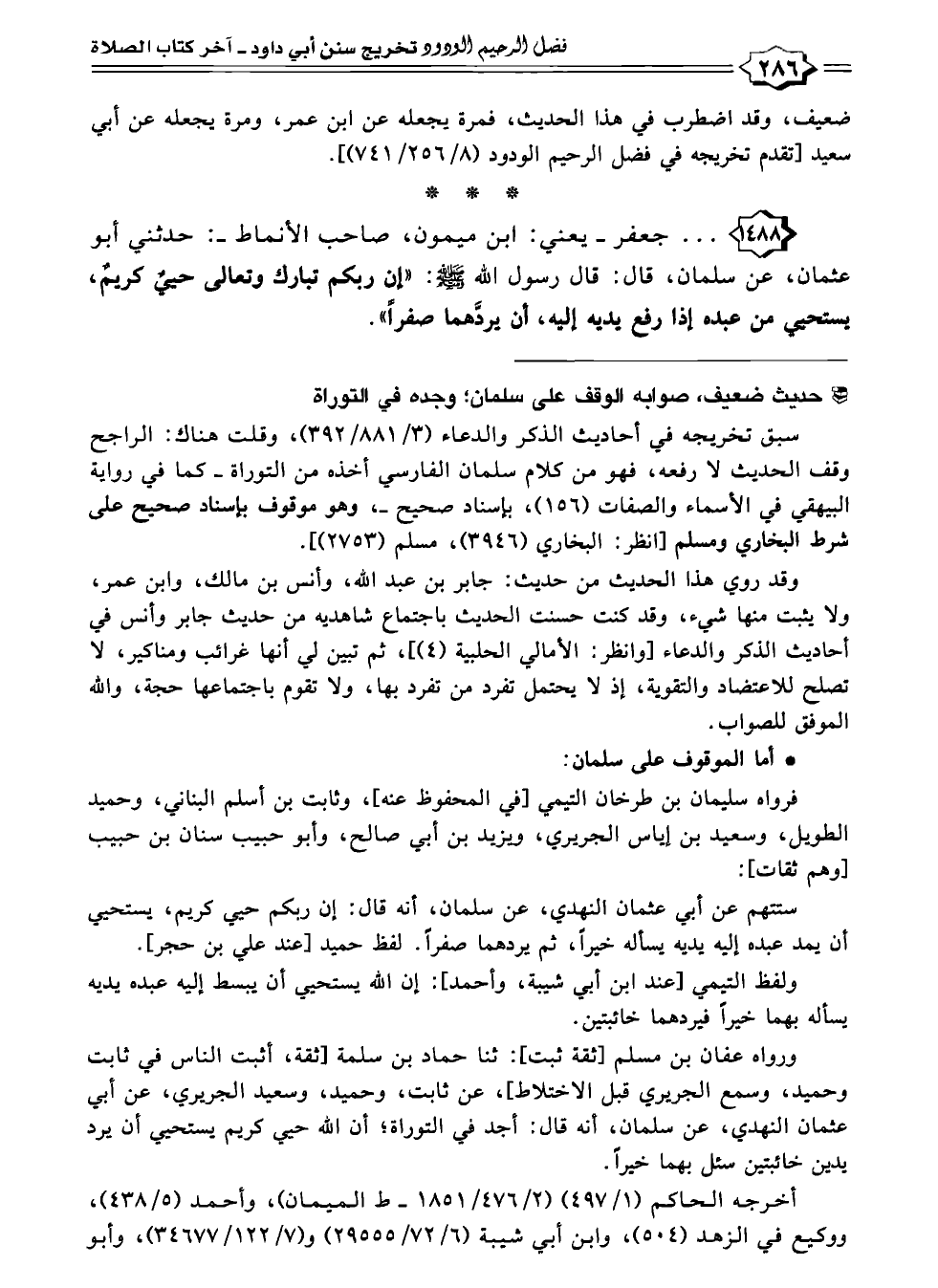 ١٤٨٨ - . . . جعفر -يعني: ابن ميمون، صاحب الأنماط-: حدثني أبو عثمان، عن سلمان، قال: قال رسول اللّه - صلى الله عليه وسلم -: "إن ربكم تبارك وتعالى حييٌ كريمٌ، يستحيي من عبده إذا رفع يديه إليه، أن يردَّهما صفرًا".