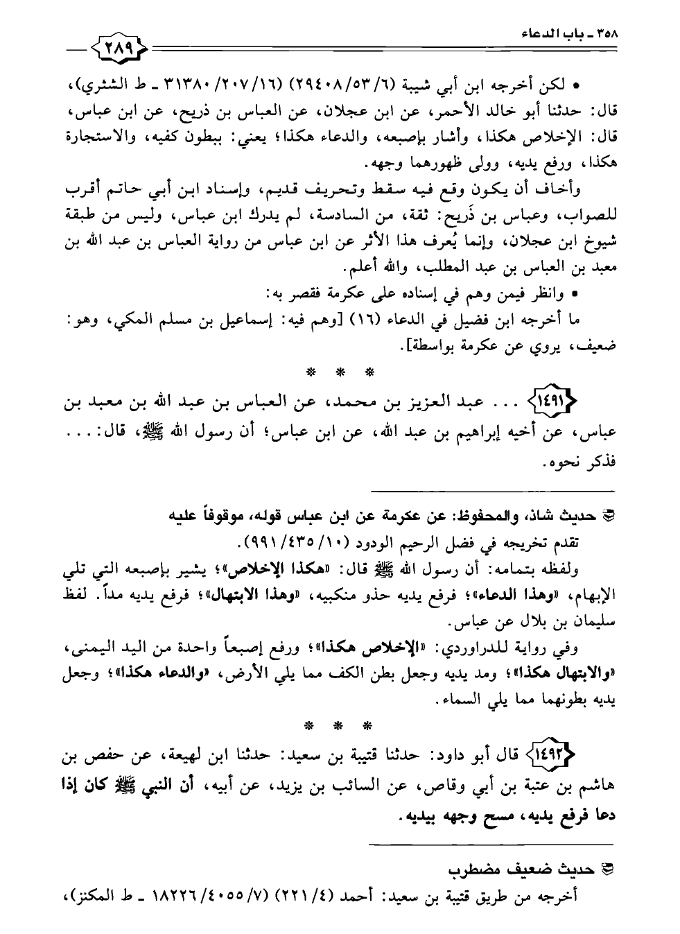 ١٤٩٢ - قال أبو داود: حدثنا قتيبة بن سعيد: حدثنا ابن لهيعة، عن حفص بن هاشم بن عتبة بن أبي وقاص، عن السائب بن يزيد، عن أبيه، أن النبي - صلى الله عليه وسلم - كان إذا دعا فرفع يديه، مسح وجهه بيديه.