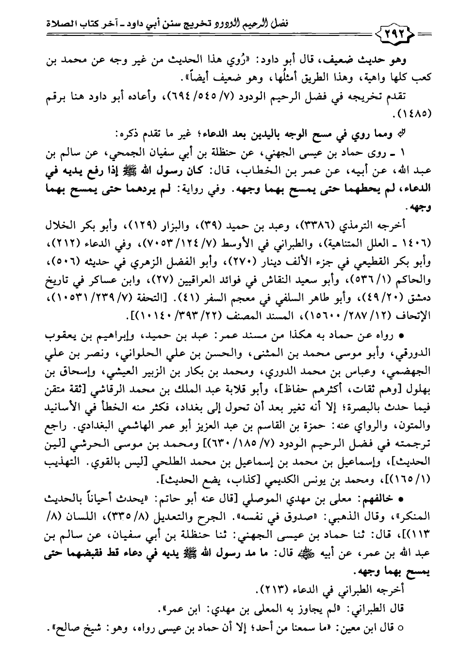 ١ - روى حماد بن عيسى الجهني، عن حنظلة بن أبي سفيان الجمحي، عن سالم بن عبد الله، عن أبيه، عن عمر بن الخطاب، قال: كان رسول الله - صلى الله عليه وسلم - إذا رفع يديه في الدعاء، لم يحطهما حتى يمسح بهما وجهه. وفي رواية: لم يردهما حتى يمسح بهما وجهه.