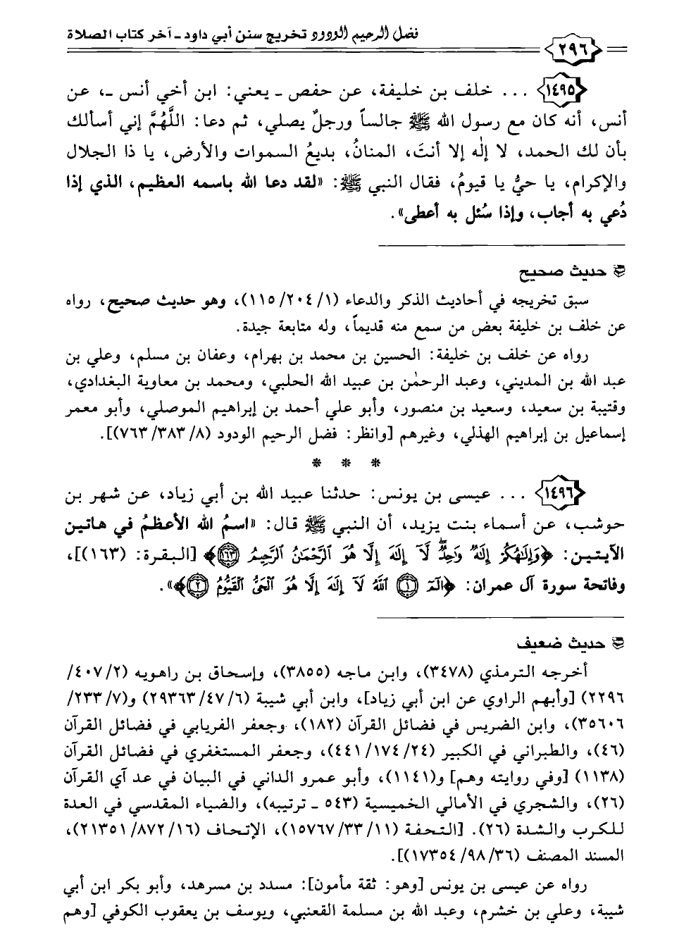 ١٤٩٥ - . . . خلف بن خليفة، عن حفص -يعني: ابن أخي أنس-، عن أنس، أنه كان مع رسول الله - صلى الله عليه وسلم - جالسًا ورجلٌ يصلي، ثم دعا: اللَّهُمَّ إني أسألك بان لك الحمد، لا إله إلا أنتَ، المنانُ، بديعُ السموات والأرض، يا ذا الجلال والإكرام، يا حيُّ يا قيومُ، فقال النبي - صلى الله عليه وسلم -: "لقد دعا اللّه باسمه العظيم، الذي إذا دُعي به أجاب، وإذا سُئل به أعطى".
