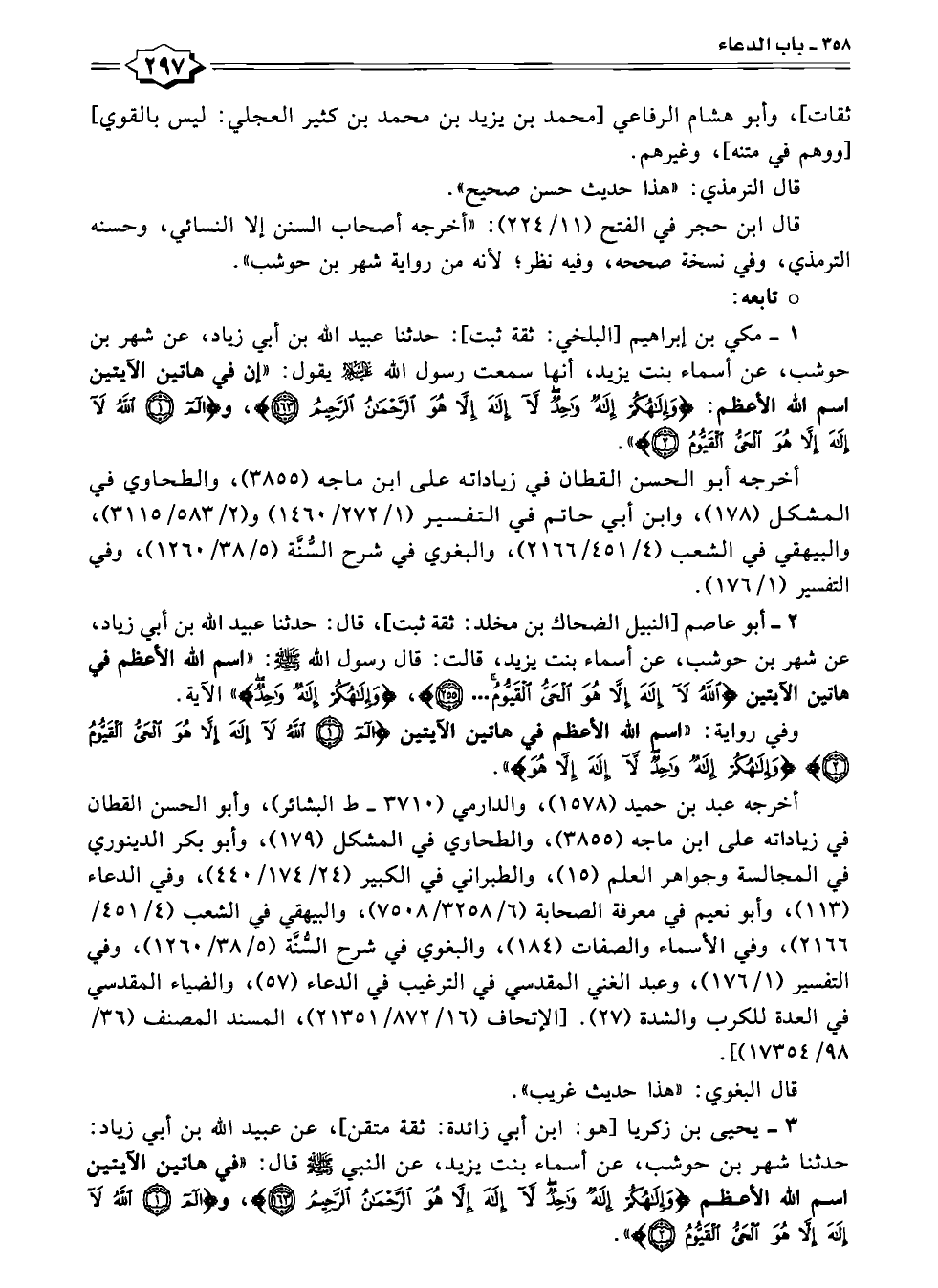٣ - يحيى بن زكريا [هو: ابن أبي زائدة: ثقة متقن]، عن عبيد الله بن أبي زياد: حدثنا شهر بن حوشب، عن أسماء بنت يزيد، عن النبي - صلى الله عليه وسلم - قال: "في هاتين الآيتين اسم اللّه الأعظم {وَإِلَهُكُمْ إِلَهٌ وَاحِدٌ لَا إِلَهَ إِلَّا هُوَ الرَّحْمَنُ الرَّحِيمُ (١٦٣)}، {الم (١) اللَّهُ لَا إِلَهَ إِلَّا هُوَ الْحَيُّ الْقَيُّومُ (٢)} ".